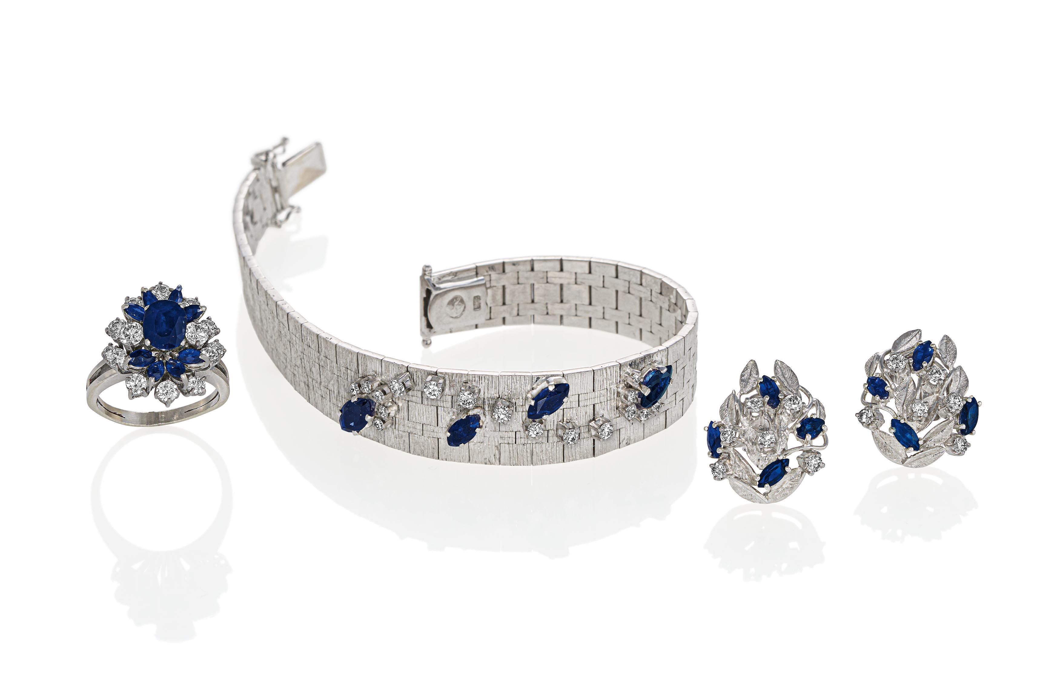 SAPHIR-DIAMANT-SET: ARMBAND, OHRSTECKER UND RING.