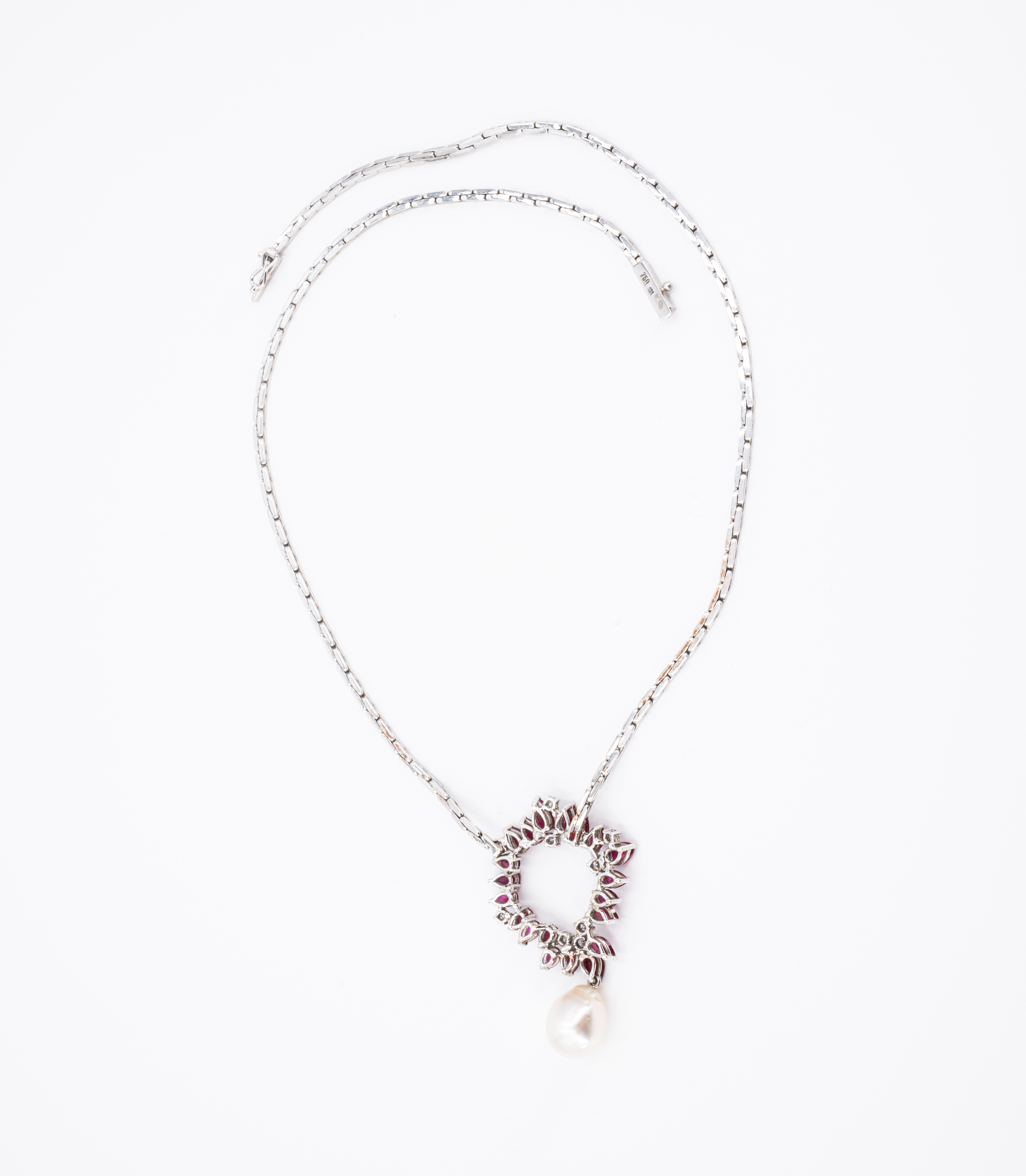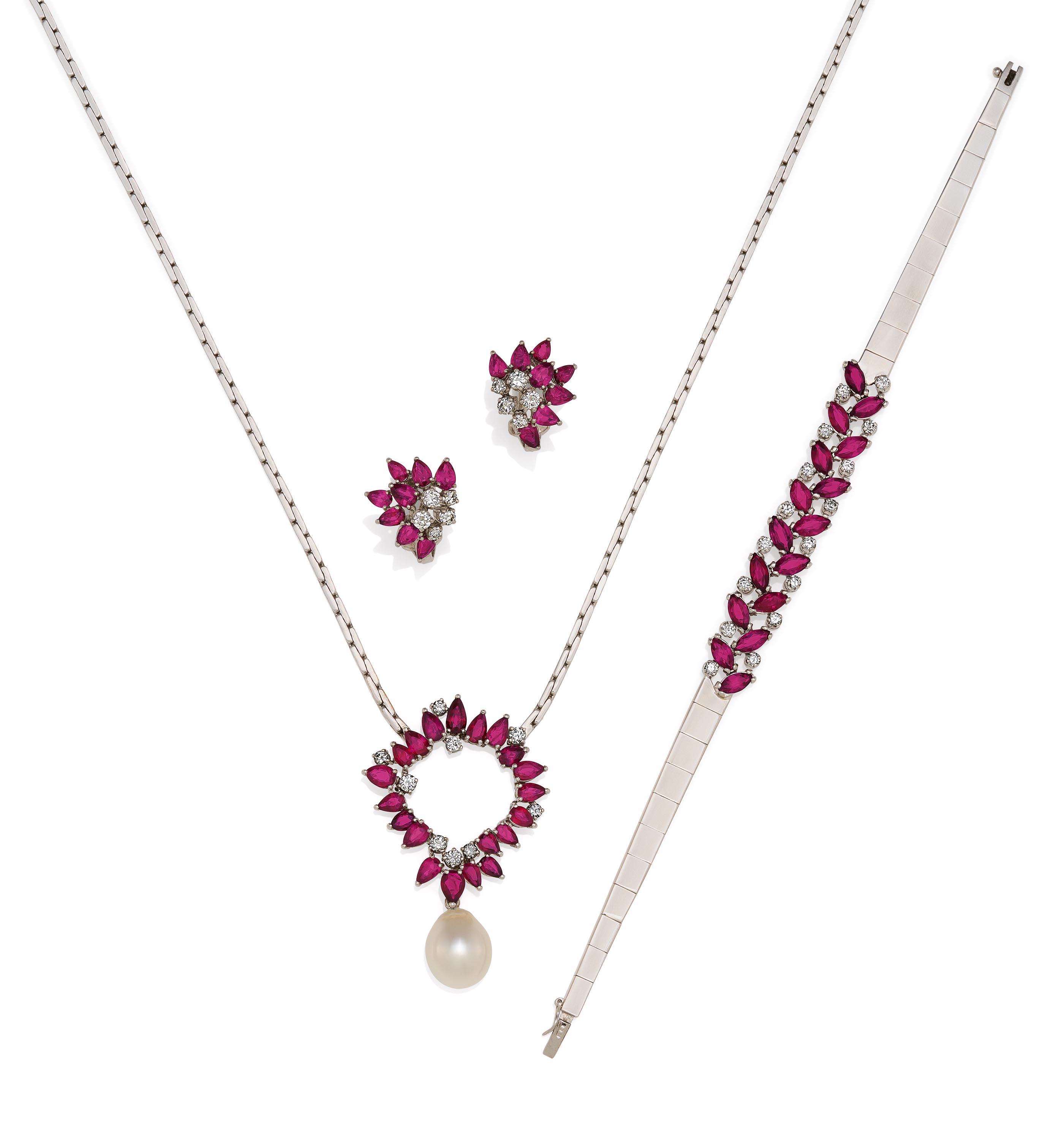RUBIN-DIAMANT-SET: COLLIER, OHRSTECLKCLIPS UND ARMBAND.