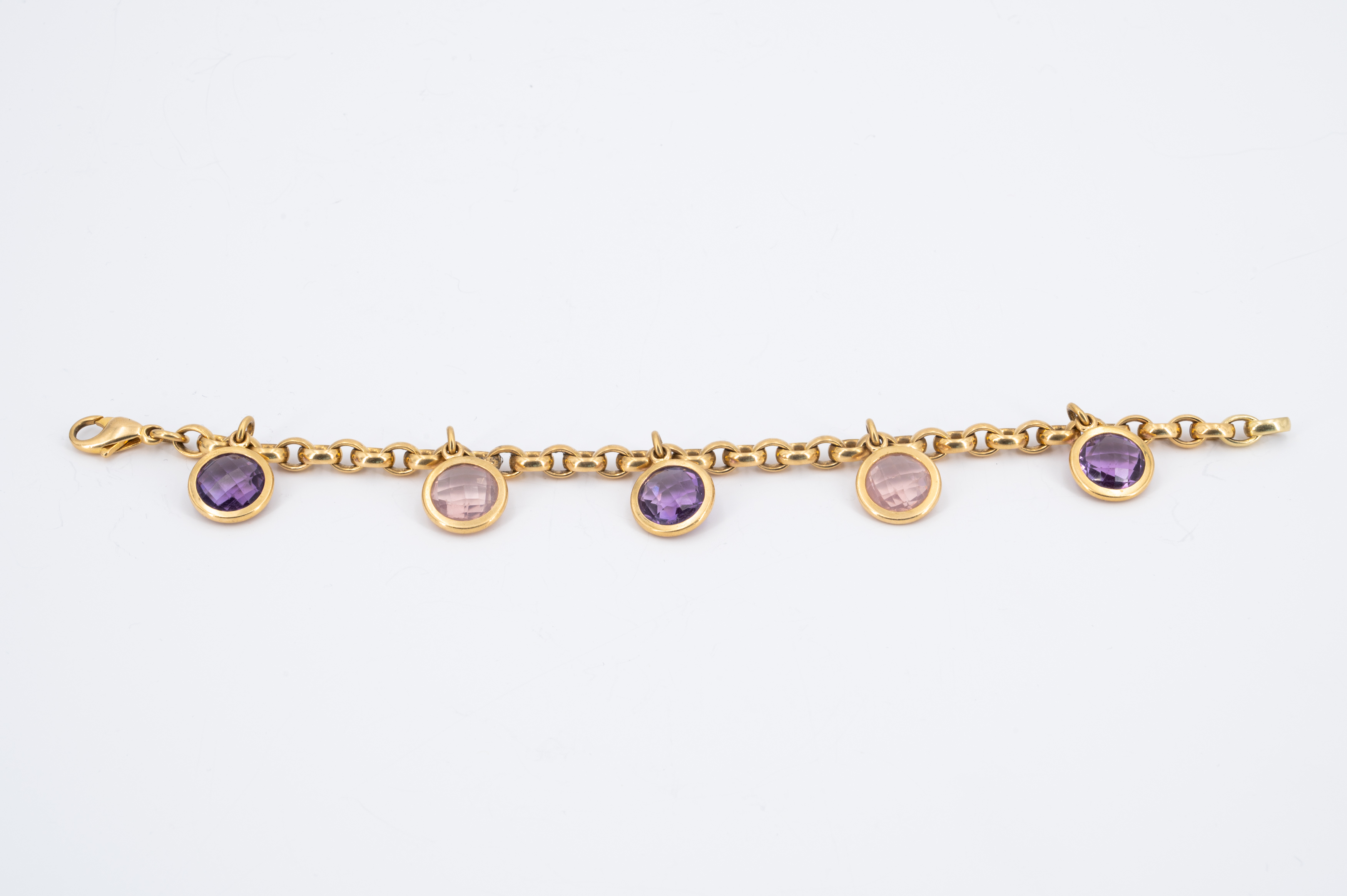 Edelsteine: 3 runde facettierte Amethyste, 2 runde facettierte Rosenquarze, zus. ca. 22,5 ct.