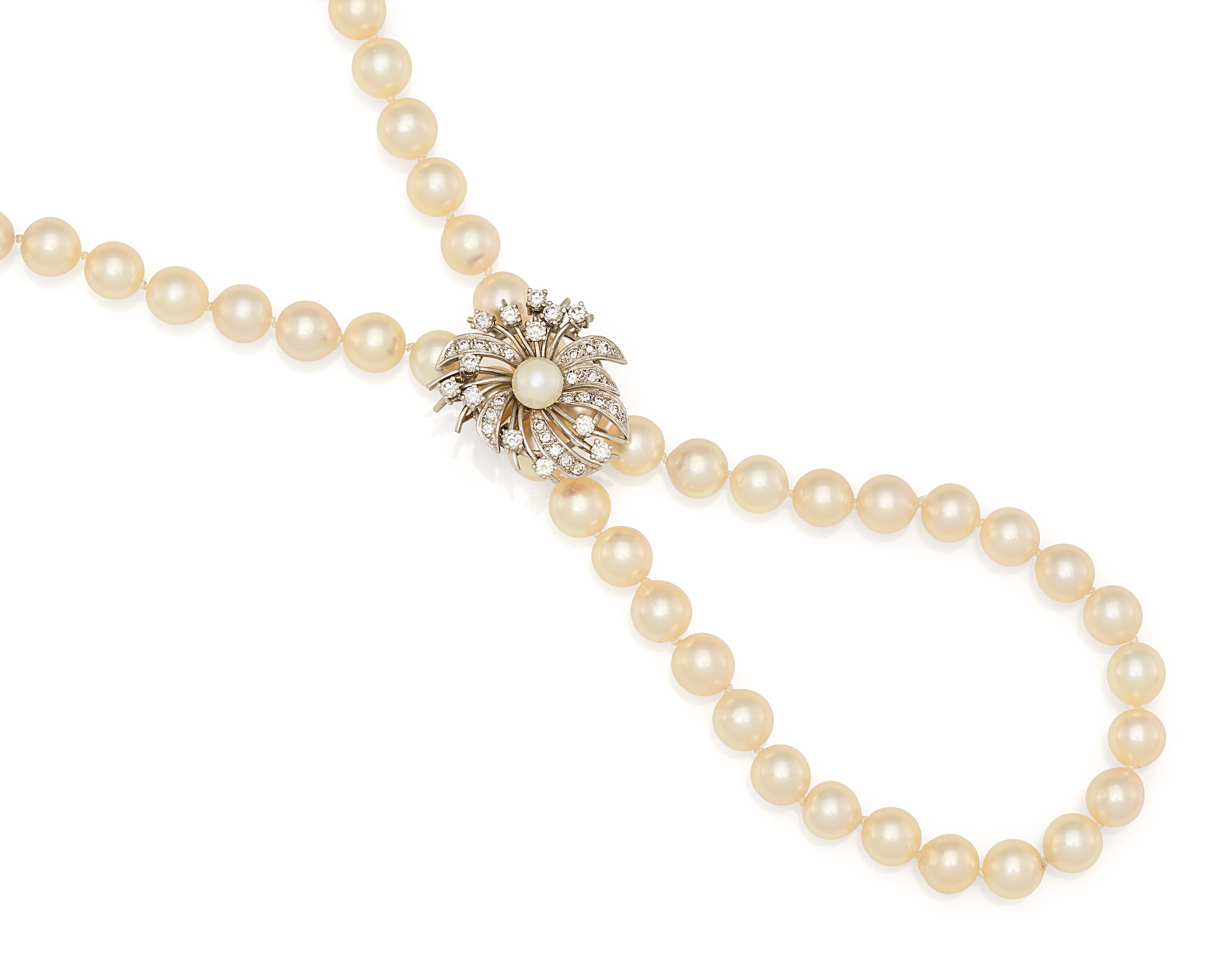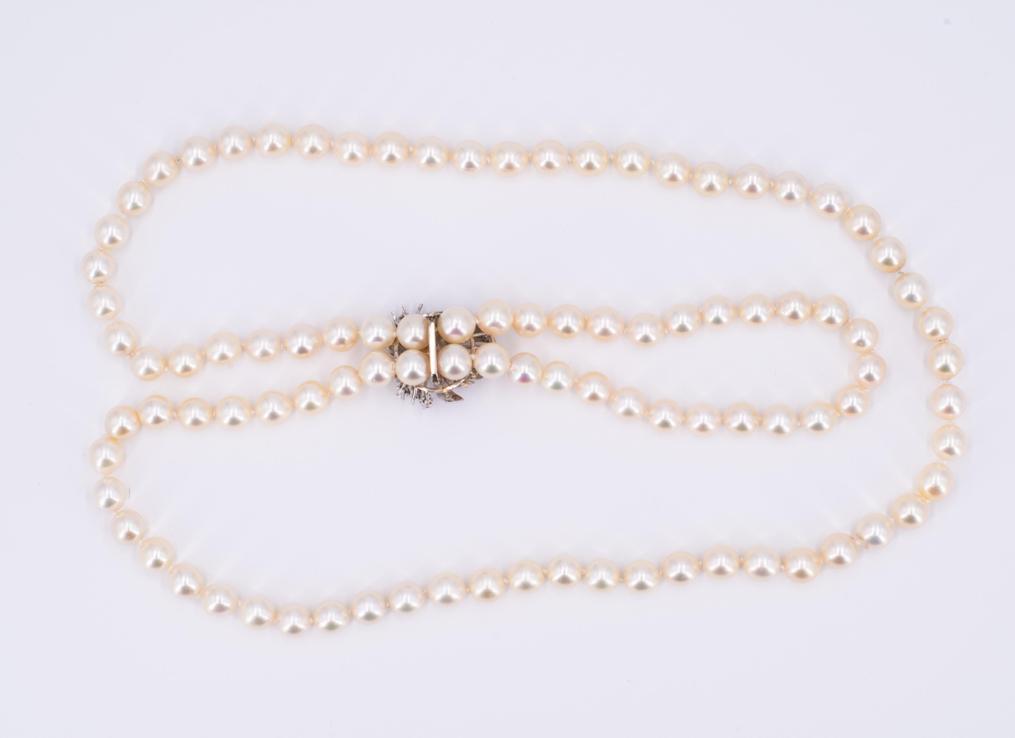 Org. Substanzen: Ca. 98 Akoya-Zuchtperlen Ø ca. 8,0 - 8,3 mm, sehr schöner Lüster, crème-rosé-irisierend.