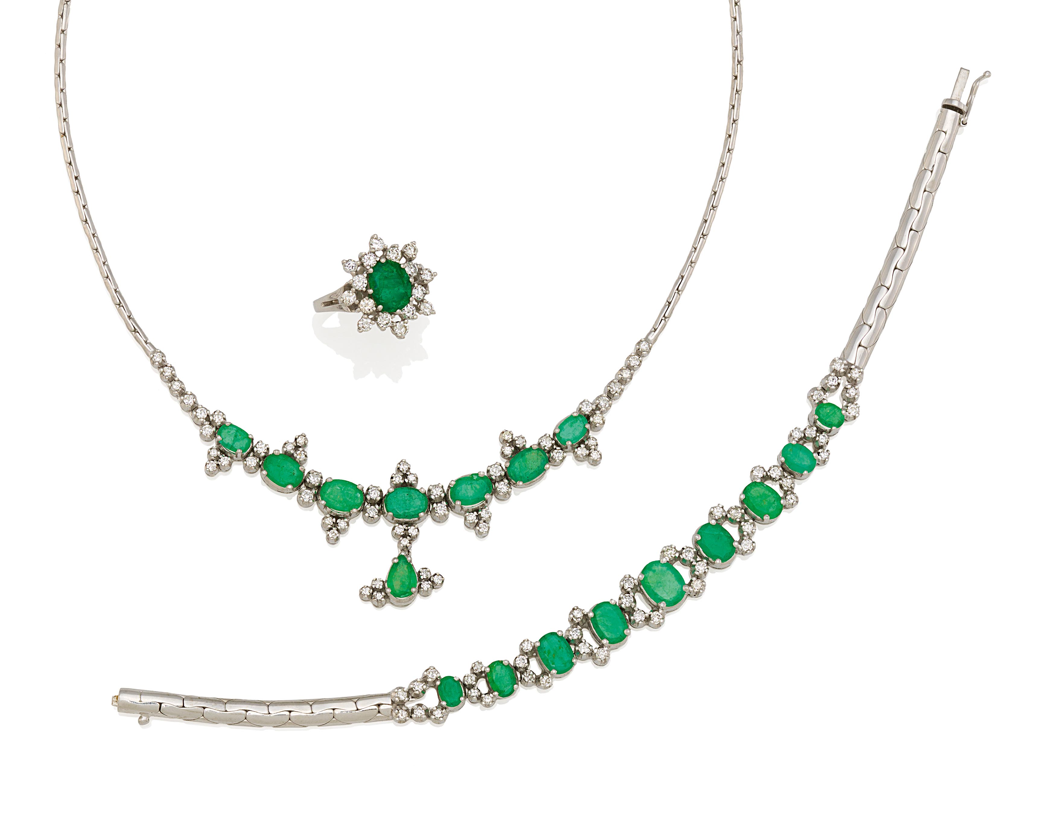 SMARAGD-DIAMANT-SET: COLLIER, RING UND ARMBAND.