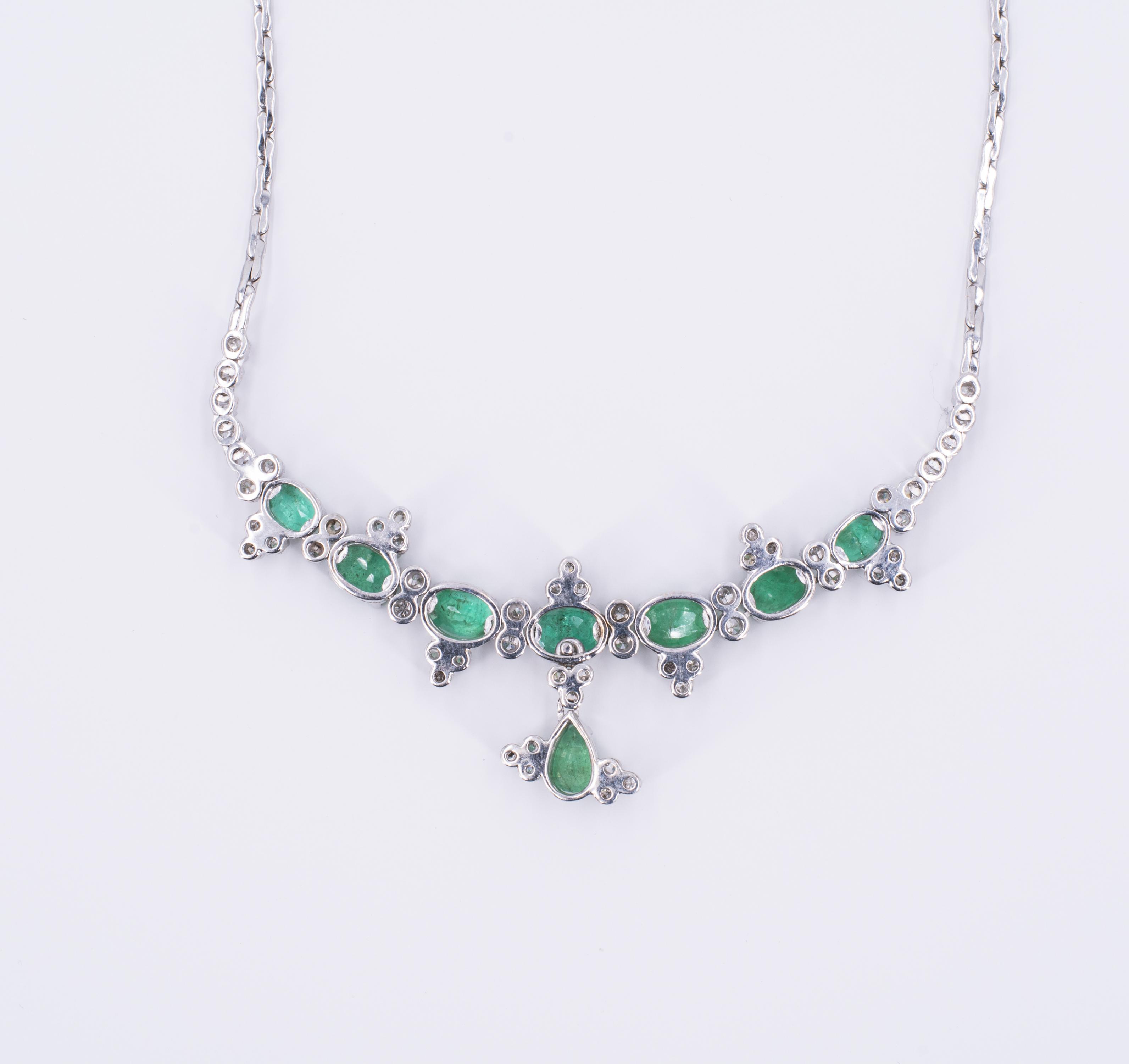 Edelsteine: 18 Smaragde, oval und tropfenförmig facettiert, zus. ca. 10,8 ct.