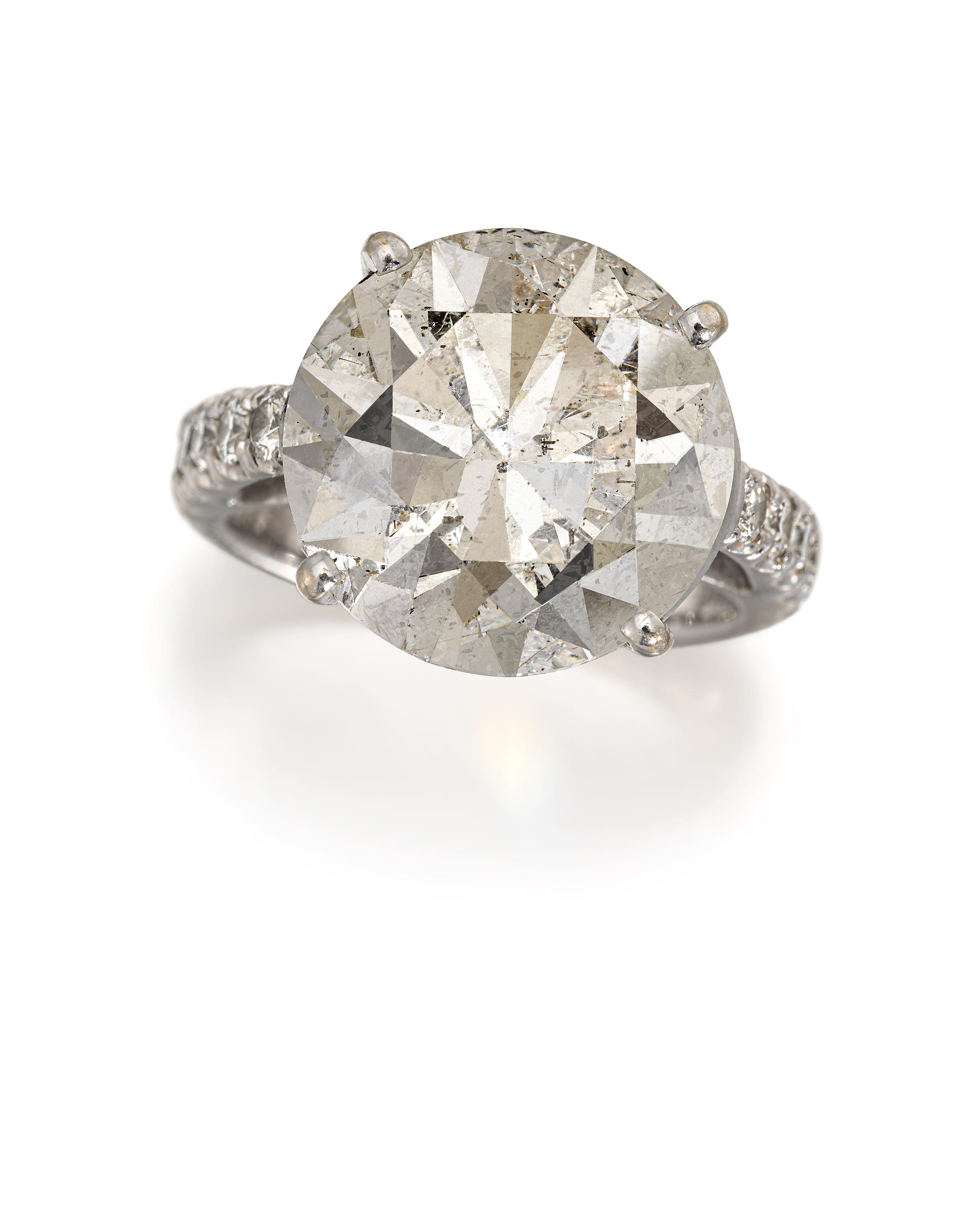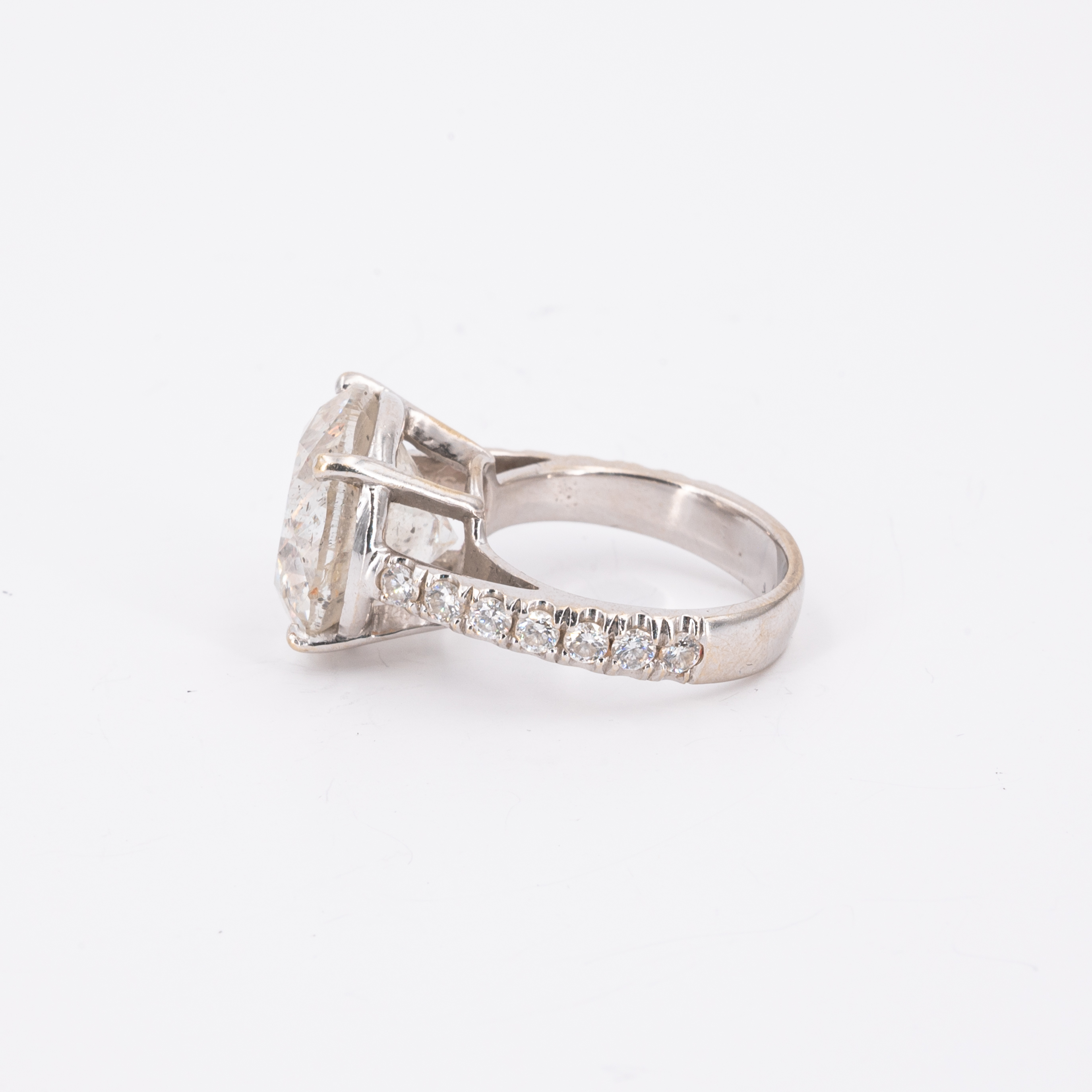 Diamanten: 1 Brillant 12,27 ct. F/P1, Politur: sehr gut, Symmetrie: sehr gut, 14 Brillanten zus. ca. 0,5 ct. G-H/SI2-P1.