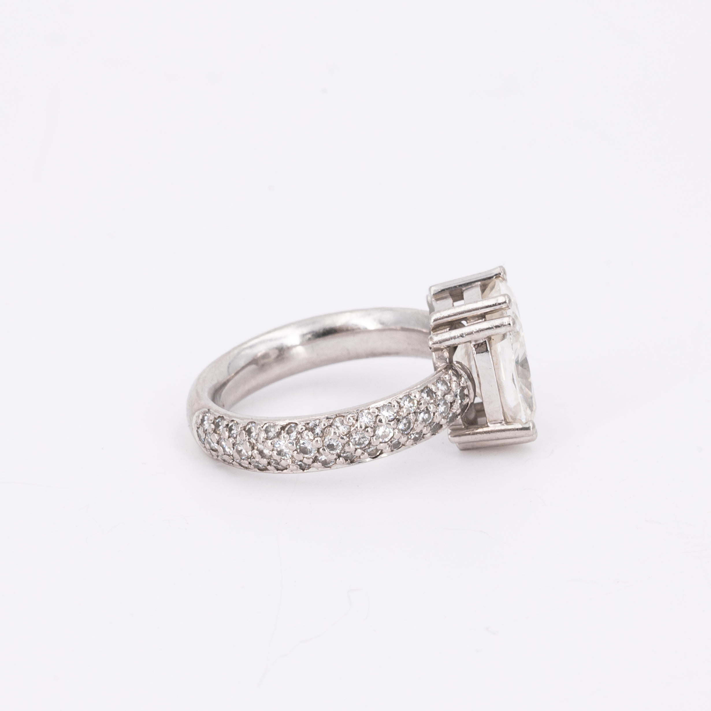 Diamanten: 1 Diamant im Kissen-Schliff 4,6 ct., I/VS1, ca. 80 kleine Brillanten zus. ca. 0,8 ct.