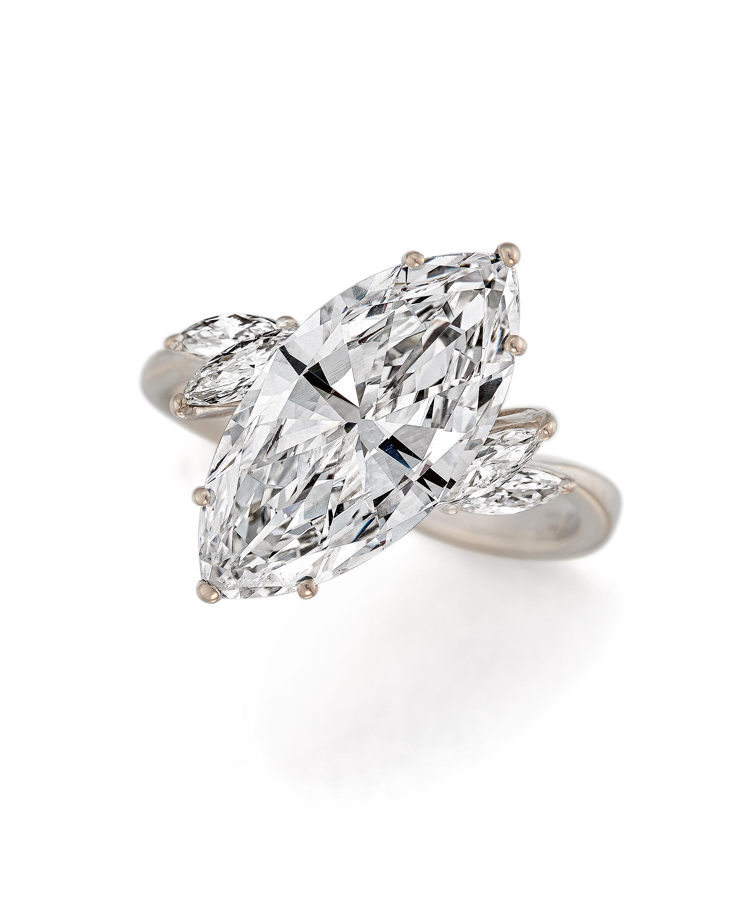 Diamanten: 1 Diamant im Navette-Schliff 4,07 ct., E/VS1, 4 kleinere Navetten zus. ca. 0,2 ct., ebenfalls ausgezeichnete Qualität.
