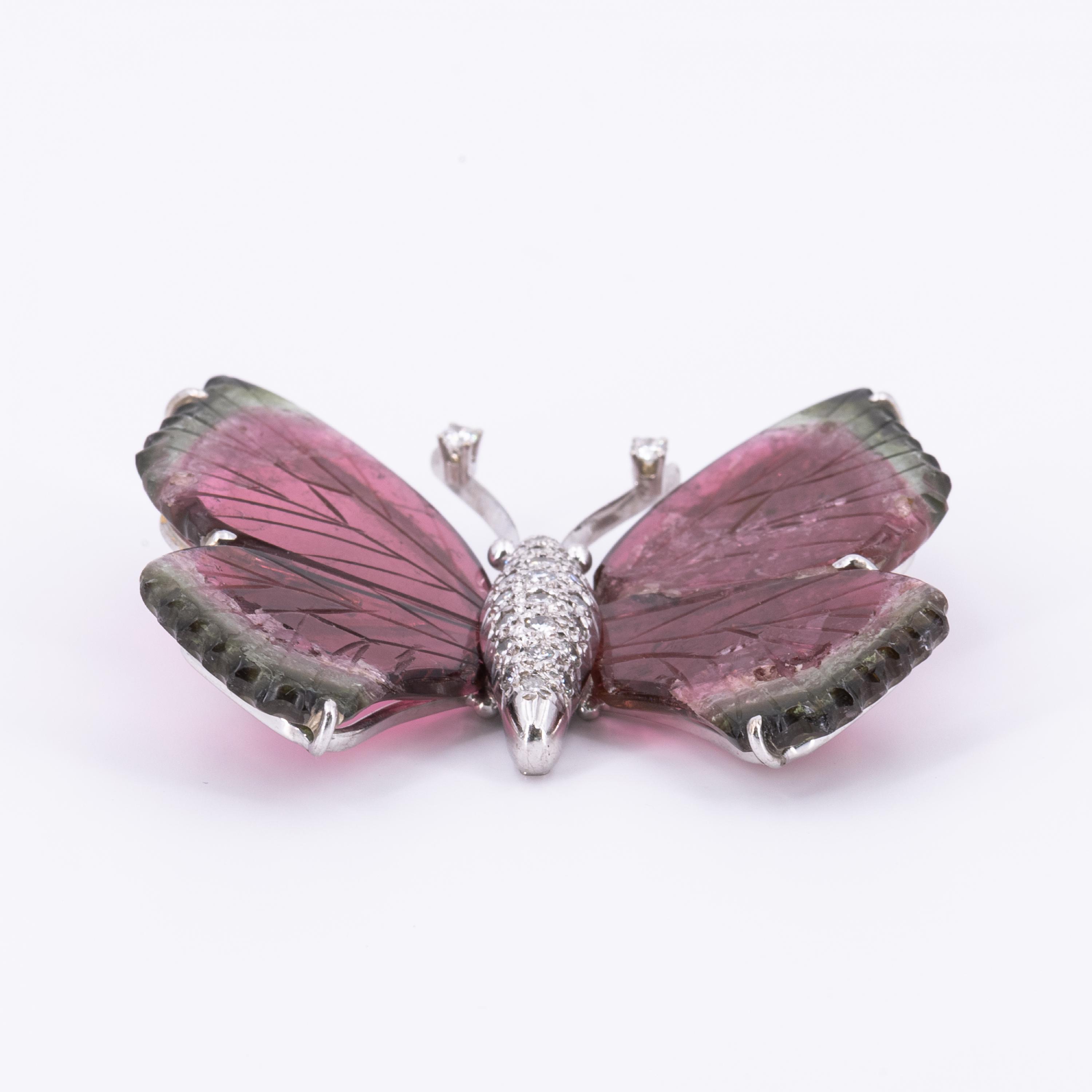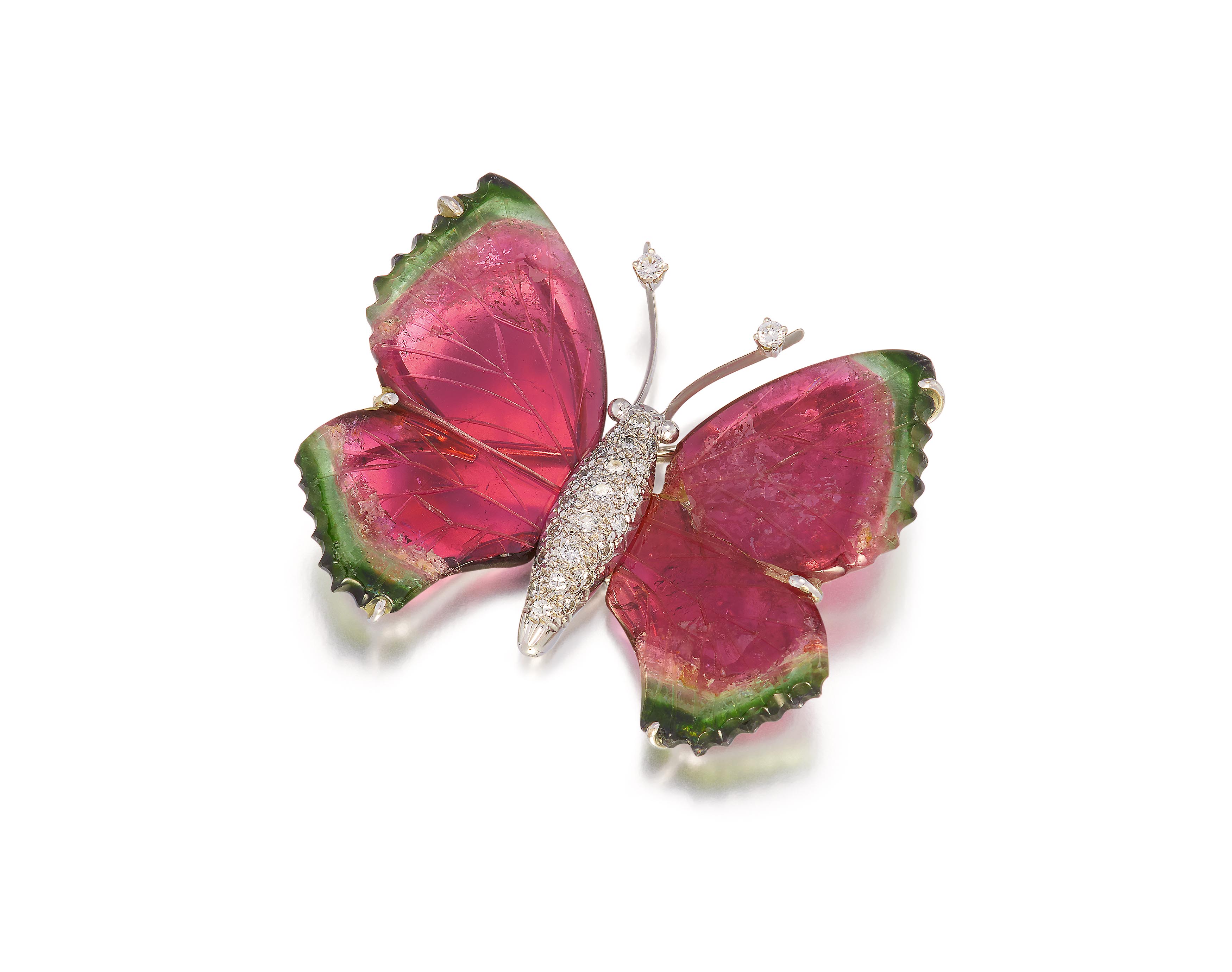 Edelsteine: 2 geschnitzte Wassermelonen-Turmaline in Form von Schmetterlingsflügeln.