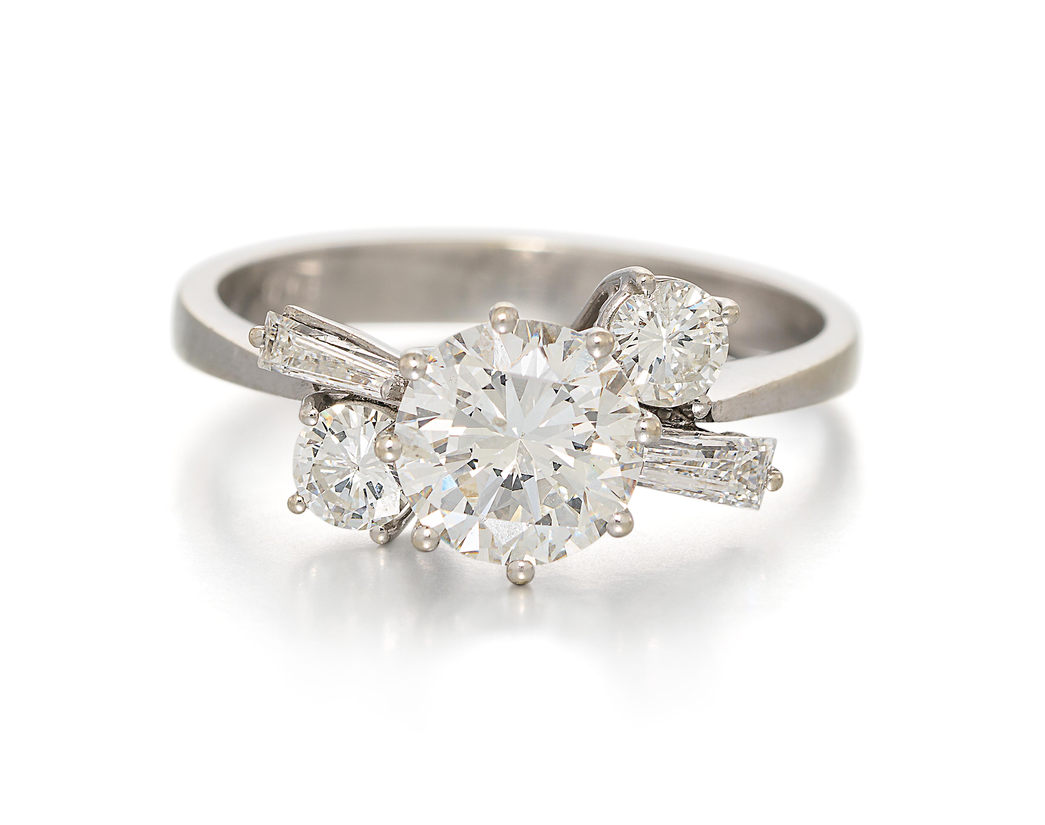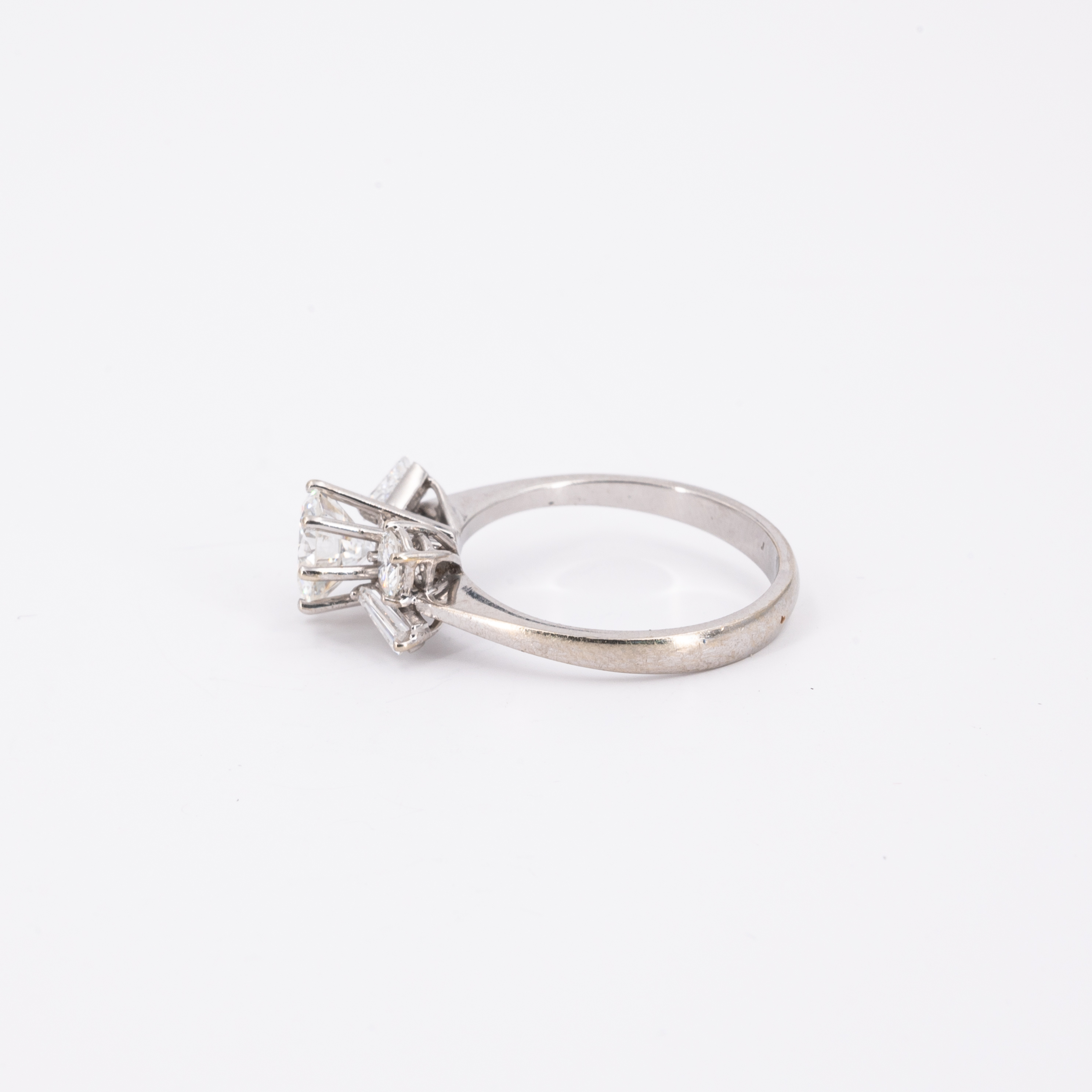 Diamanten: 1 Brillant ca. 1,1 ct., F/SI2, 2 Brillanten und 2 Diamant-Trapeze zus. ca. 0,2 ct.