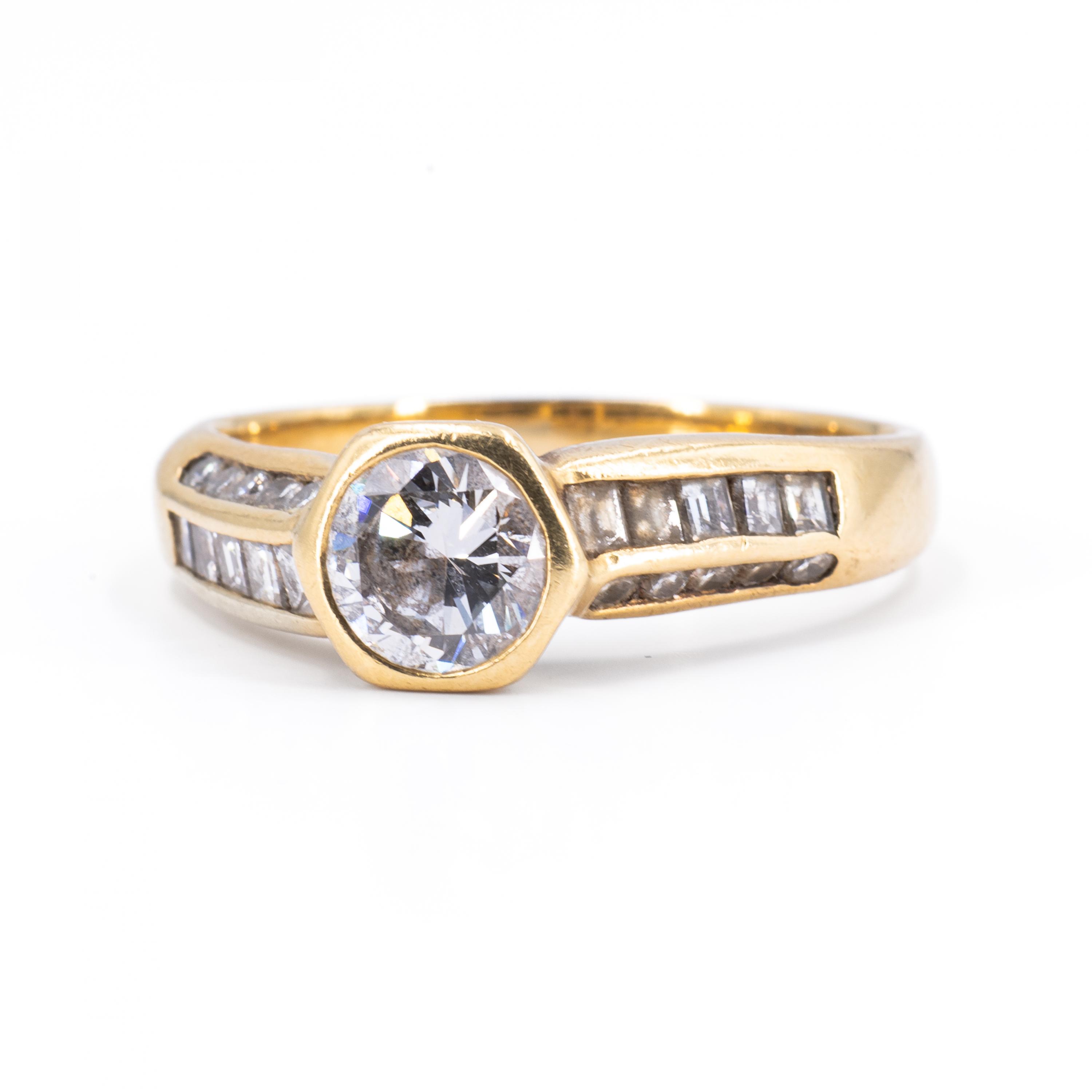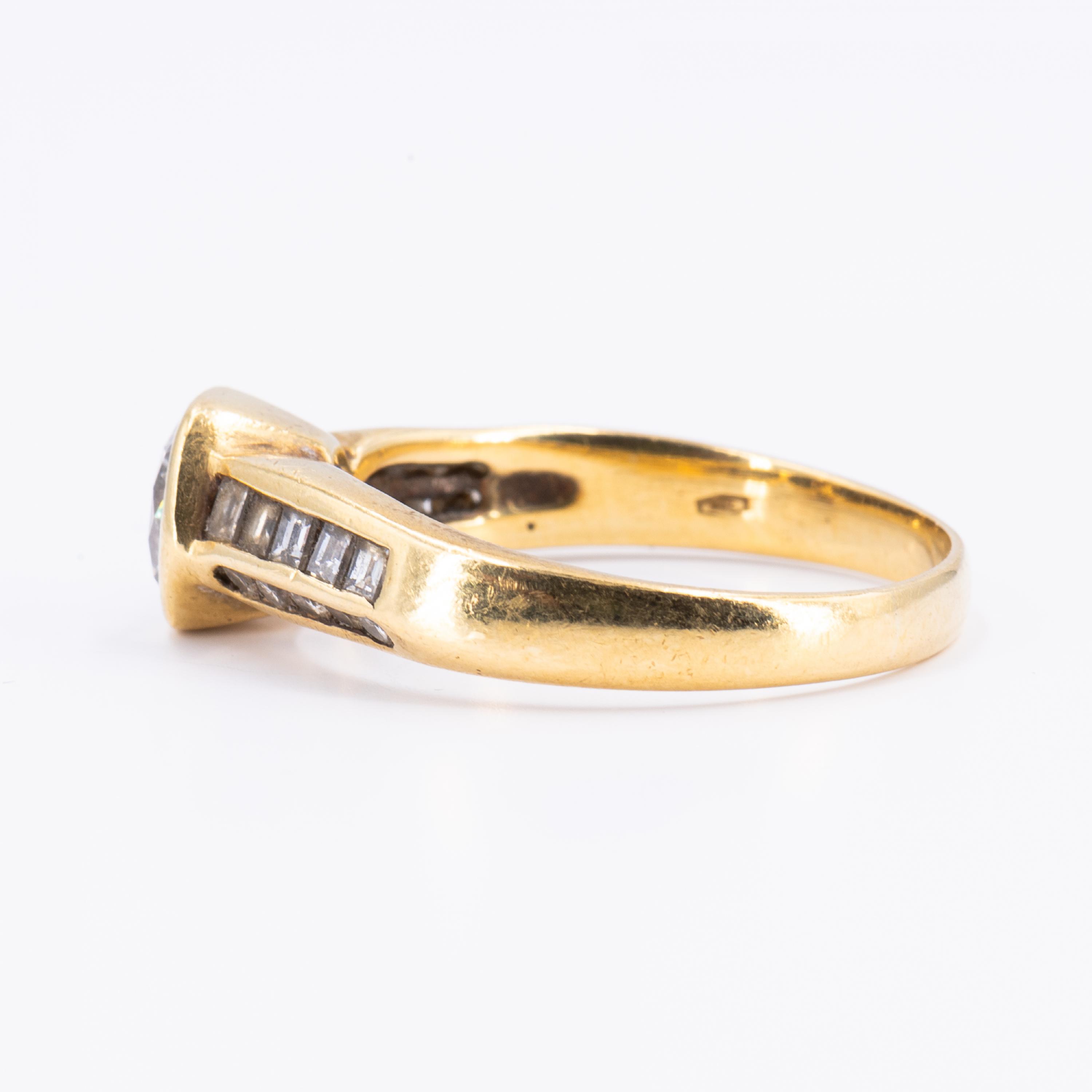 Diamanten: 1 Brillant ca. 0,8 ct. L/VS2, 10 winzige Brillanten und 10 Diamanten im Baguette-Schliff.
