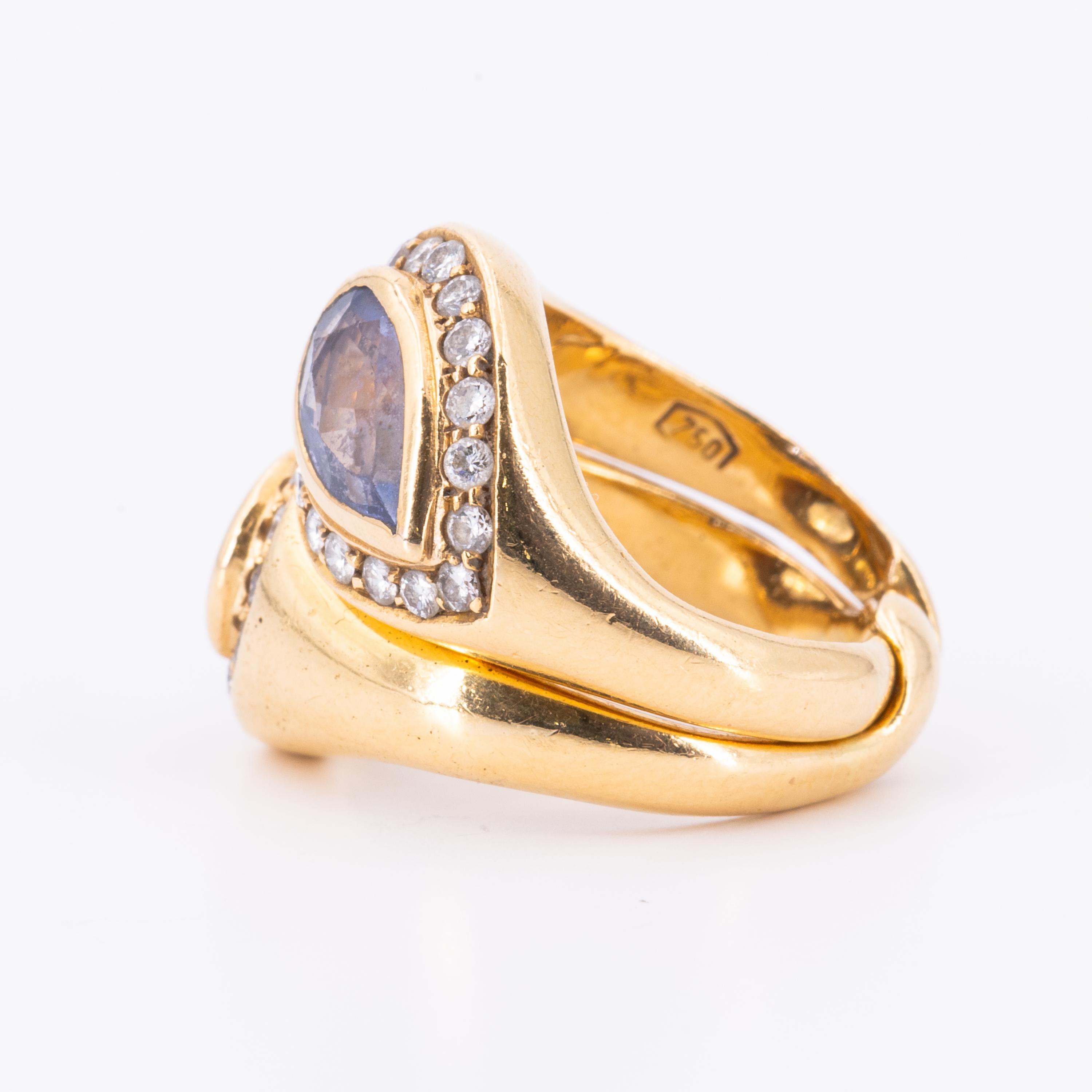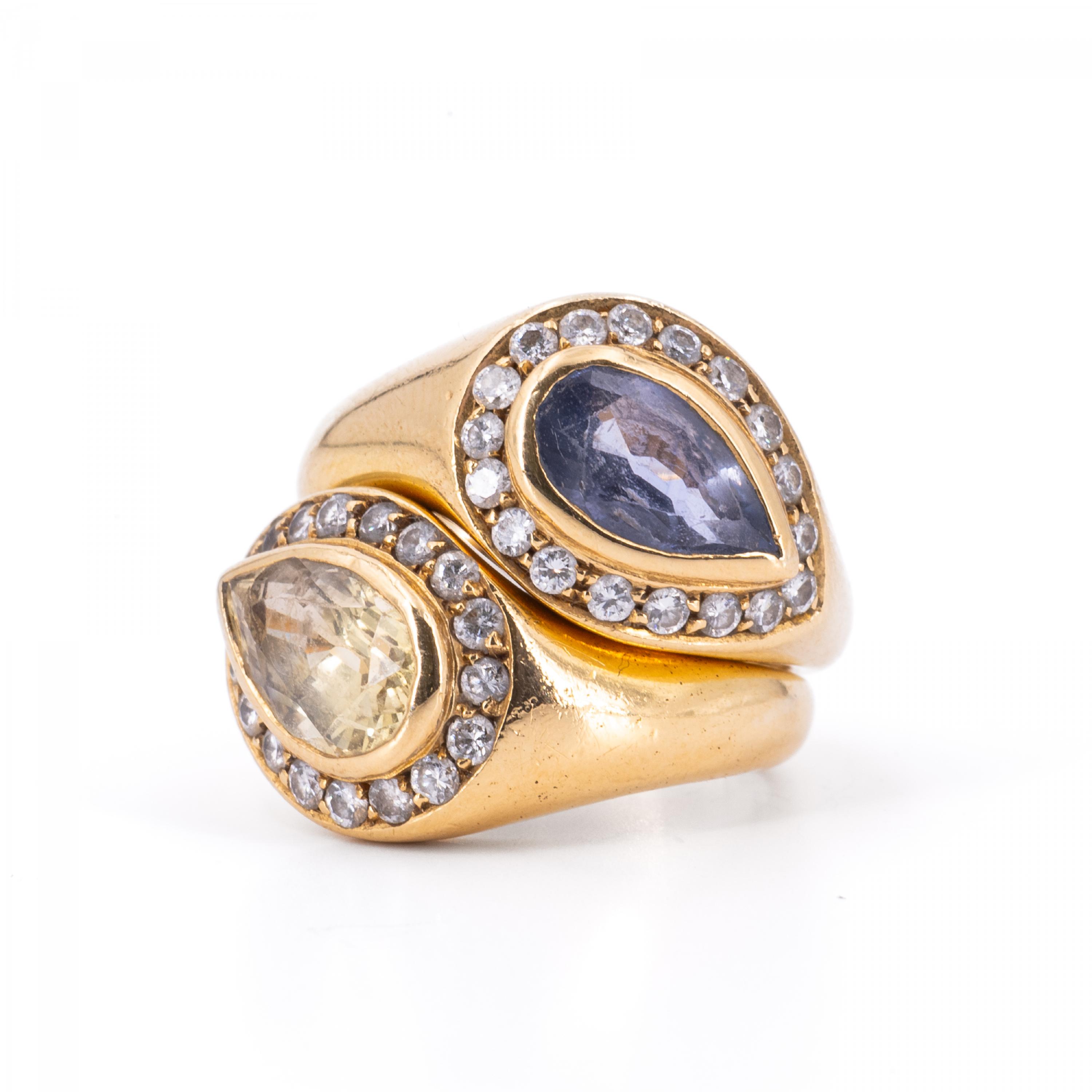 Edelsteine: 2 Saphire, gelb und blau, im Tropfen-Schliff zus. ca. 2,2 ct.