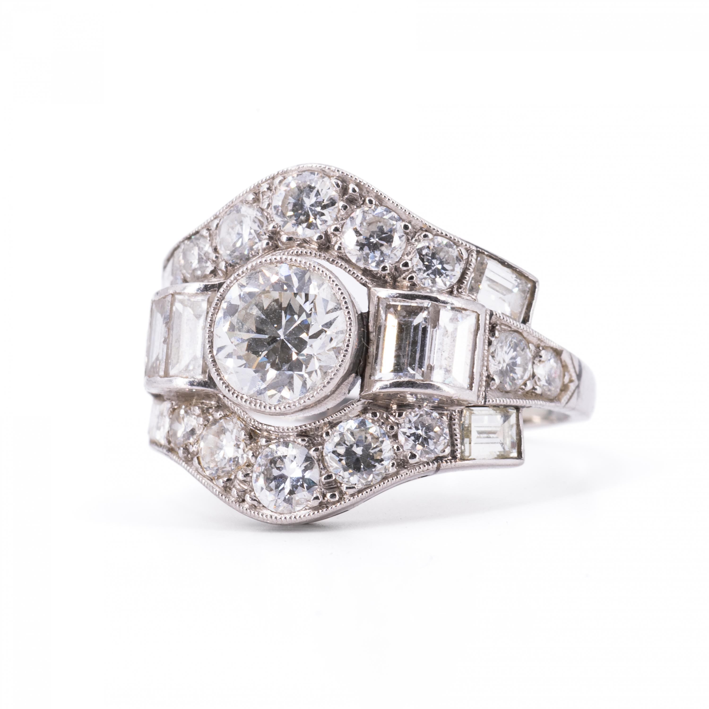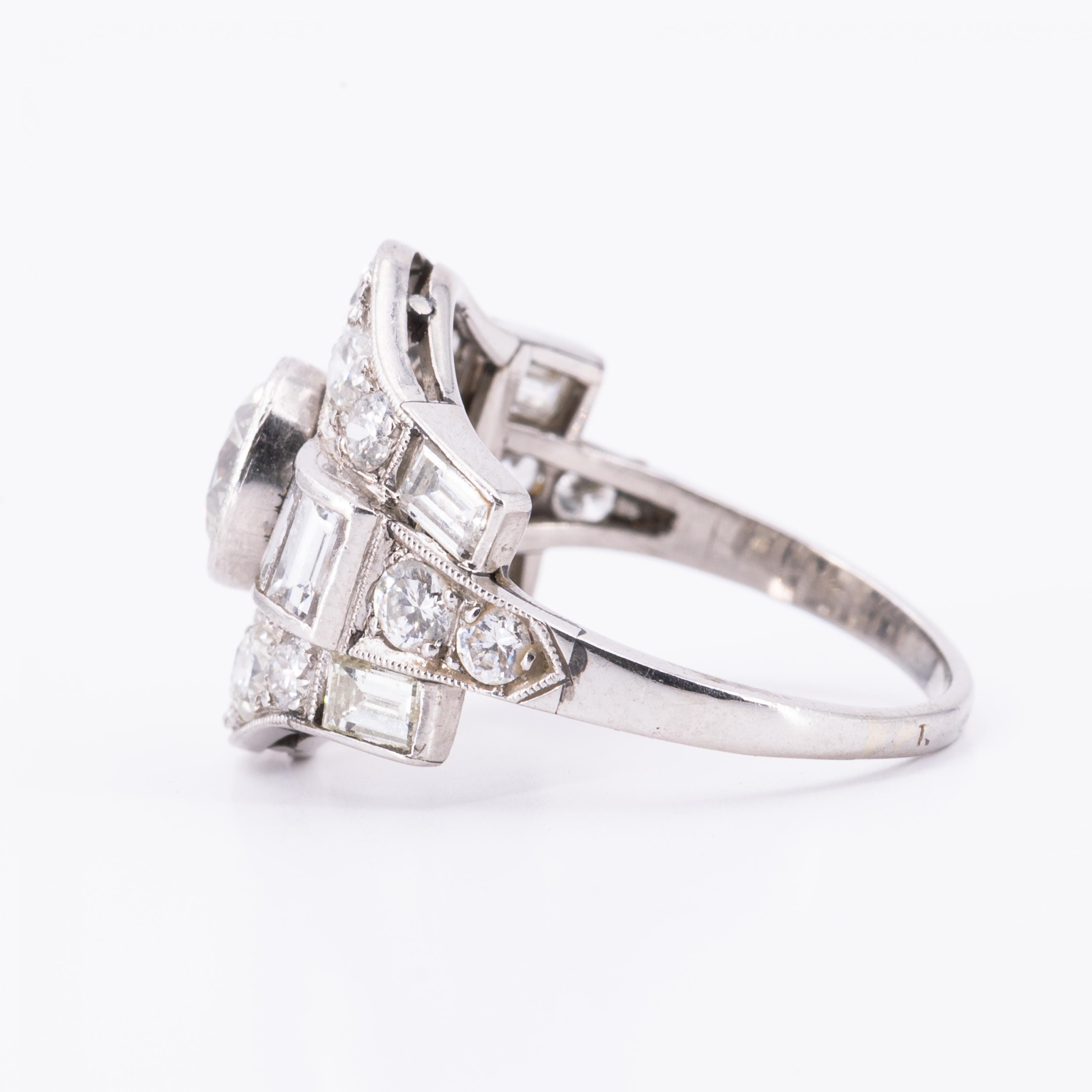 Diamanten: 1 Diamant im Alt-Schliff ca. 0,8 ct., I/VS2, 14 Diamanten im Alt-Schliff Ø ca. 1,7 - 2,7 mm, 8 Diamanten im Baguette-Schliff.