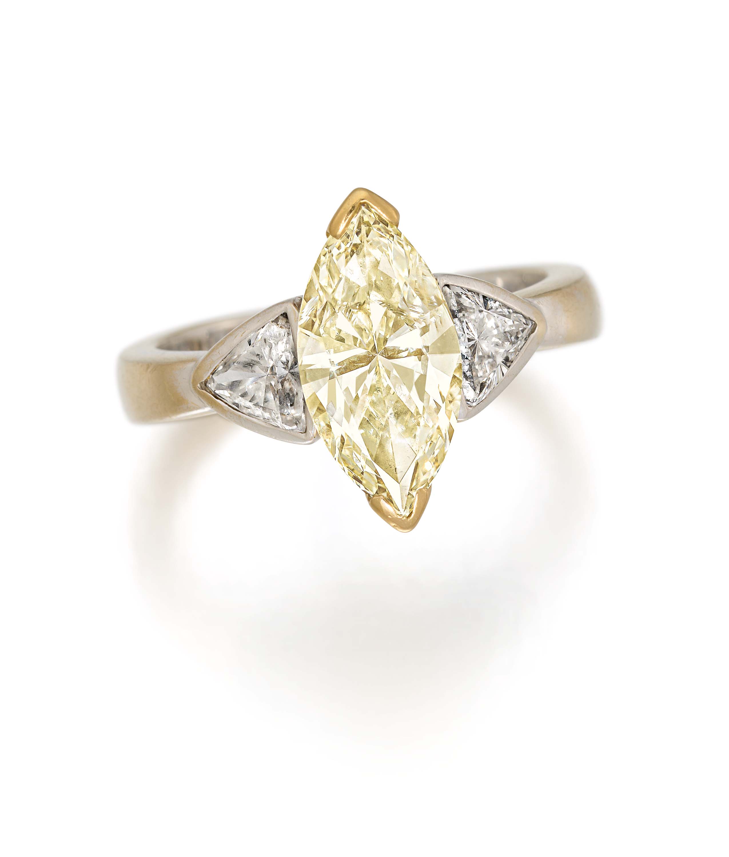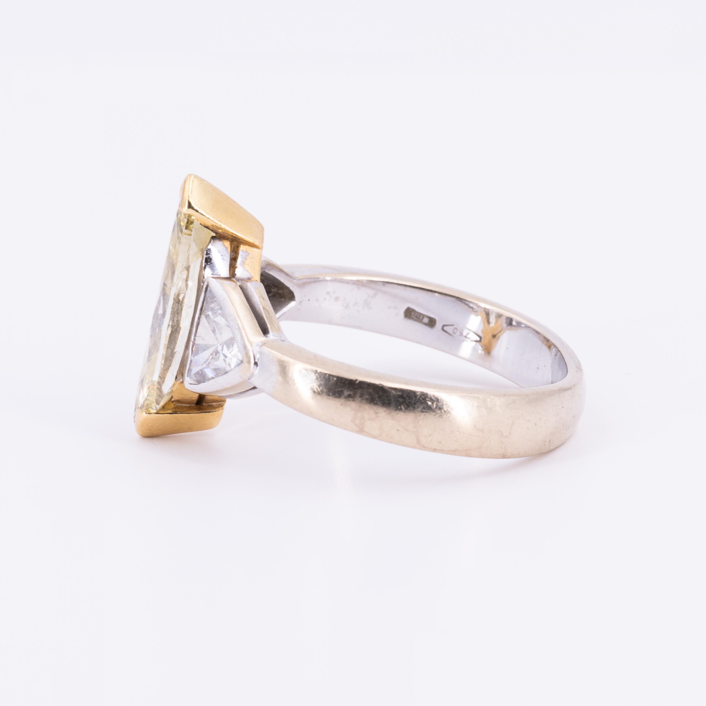 Diamanten: 1 Diamant im Navette-Schliff ca. 2,4 ct., getönt/P1, 2 dreieckige geschliffene Diamanten zus. ca. 0,5 ct., ein Stein defekt.