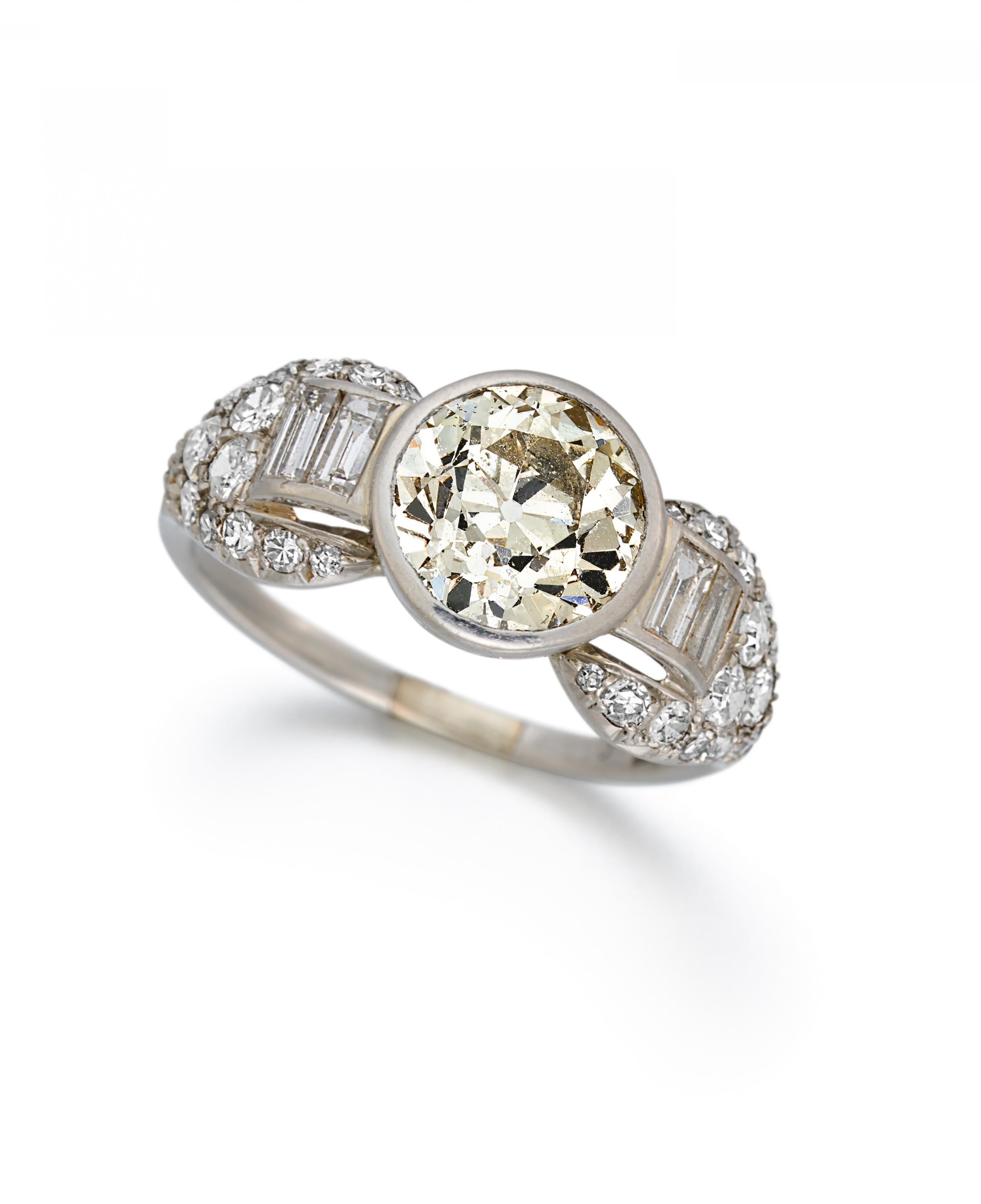 Diamanten: 1 Diamant im Alt-Schliff ca. 2,2 ct., N/SI2, 32 Diamanten im Alt-Schliff und 4 Diamanten im Baguette-Schliff zus. ca. 0,4 ct., K-M/P.