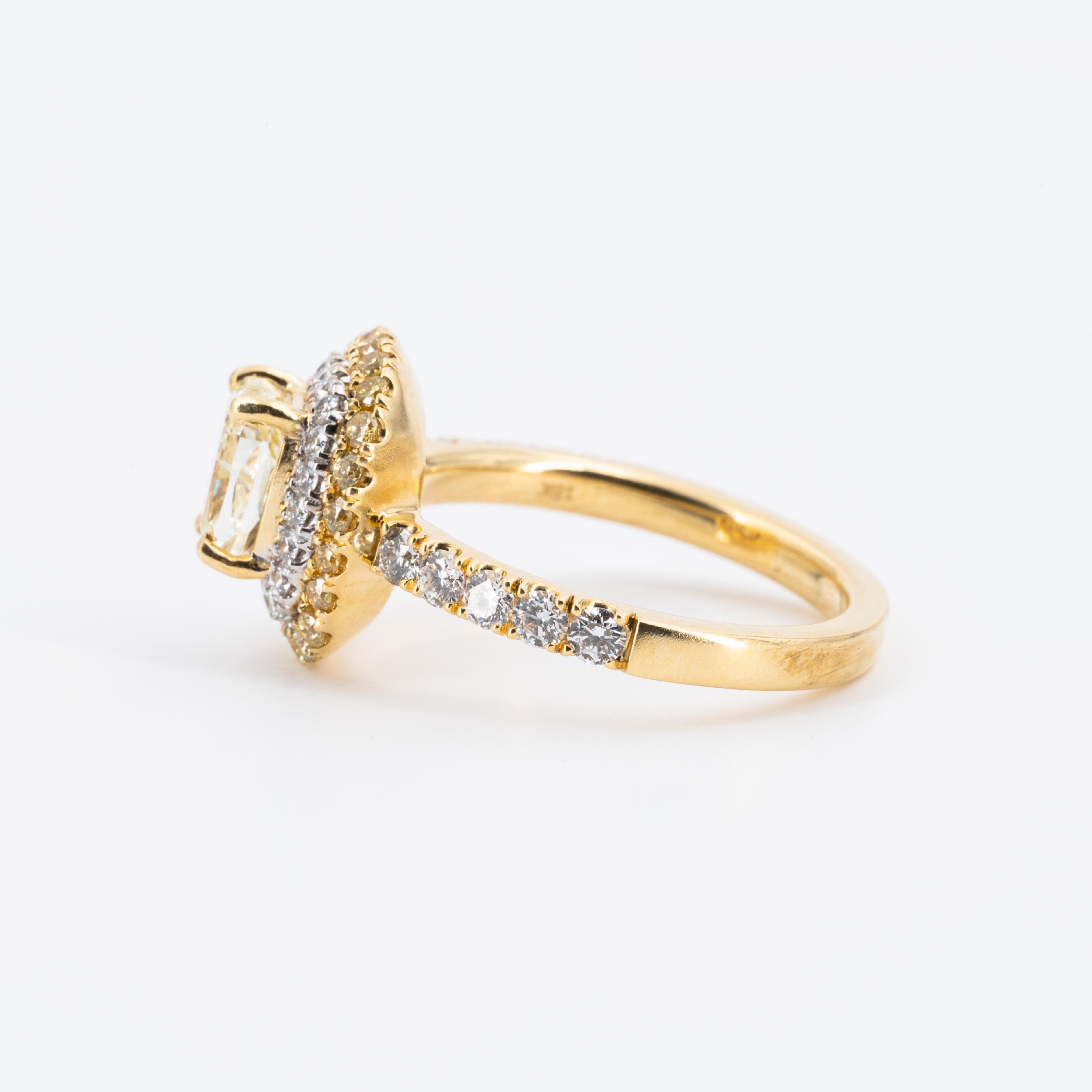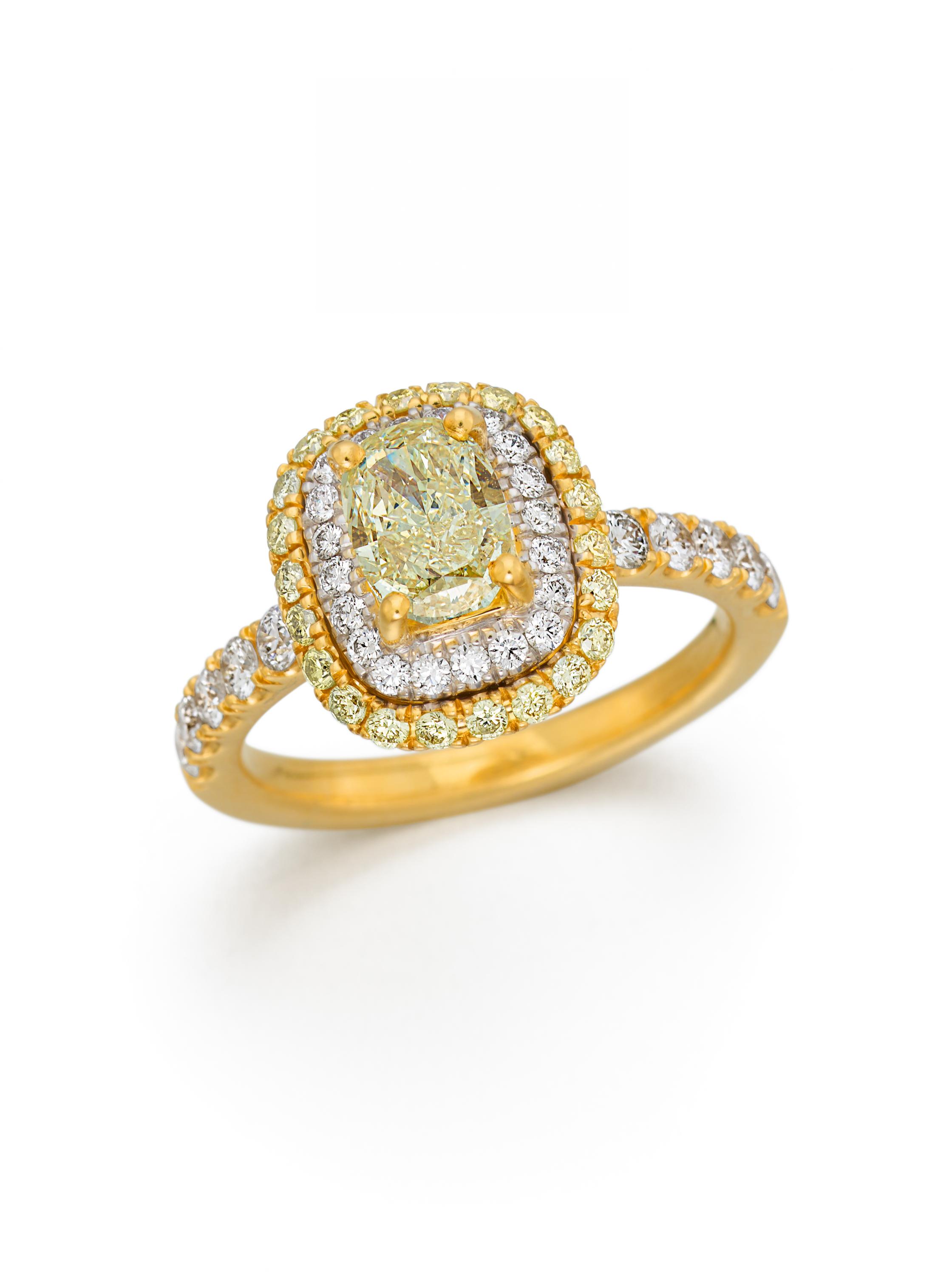 Diamanten: 1 Diamant im Kissen-Schliff, 1,16 ct., fancy Yellow, Fluoreszenz: leicht (blau), 28 Brillanten zus. ca. 0,4 ct., VVS-VS/E-H, 22 Brillanten, fancy Yellow, zus. ca. 0,2 ct.