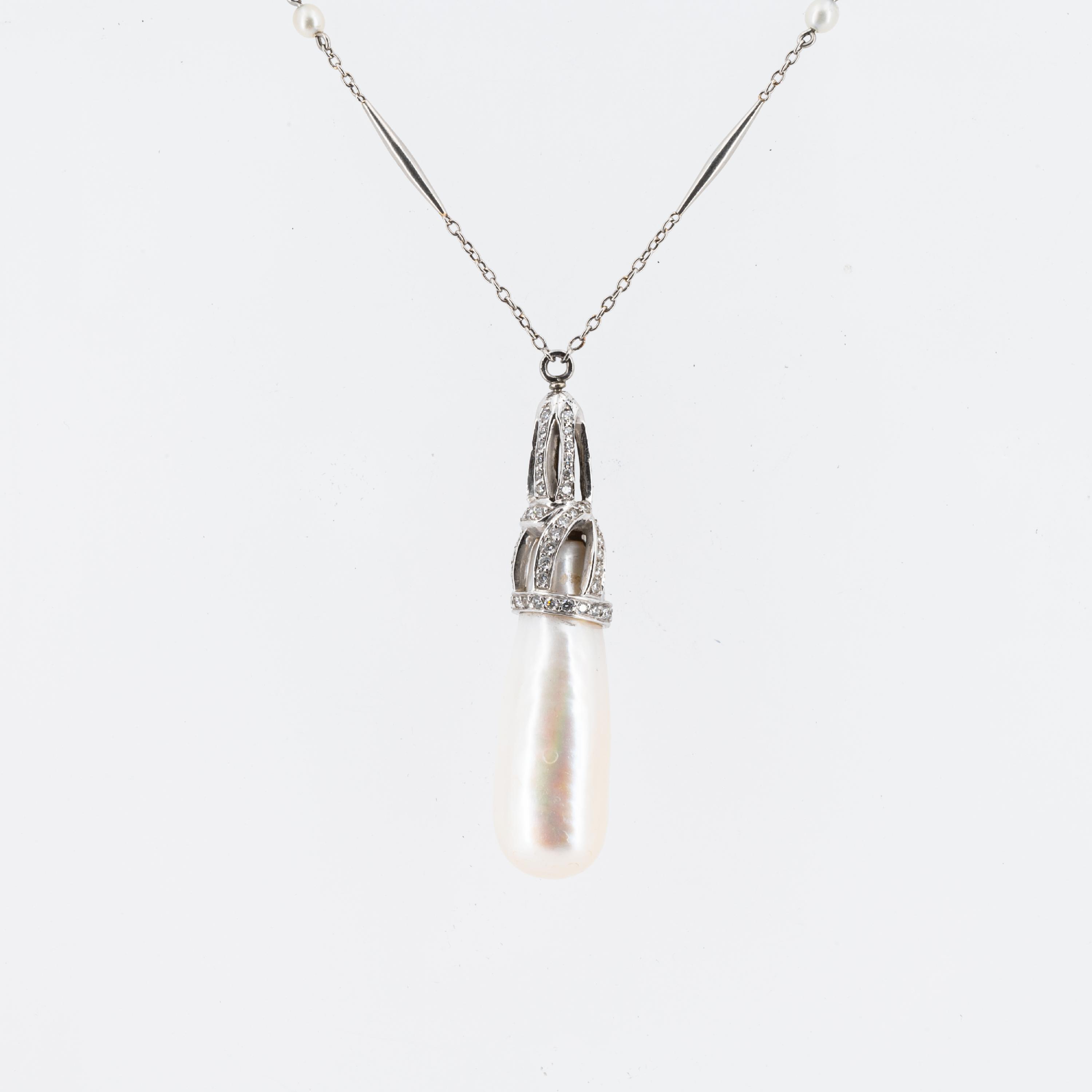 Org. Substanzen: 1 natürliche Süßwasser-Perle 38,14 ct., 12,11 x 12,39 x 36,60 mm, weiß, 16 kleine Saatperlen Ø ca. 3,2 - 3,8 mm, creme-farben.
