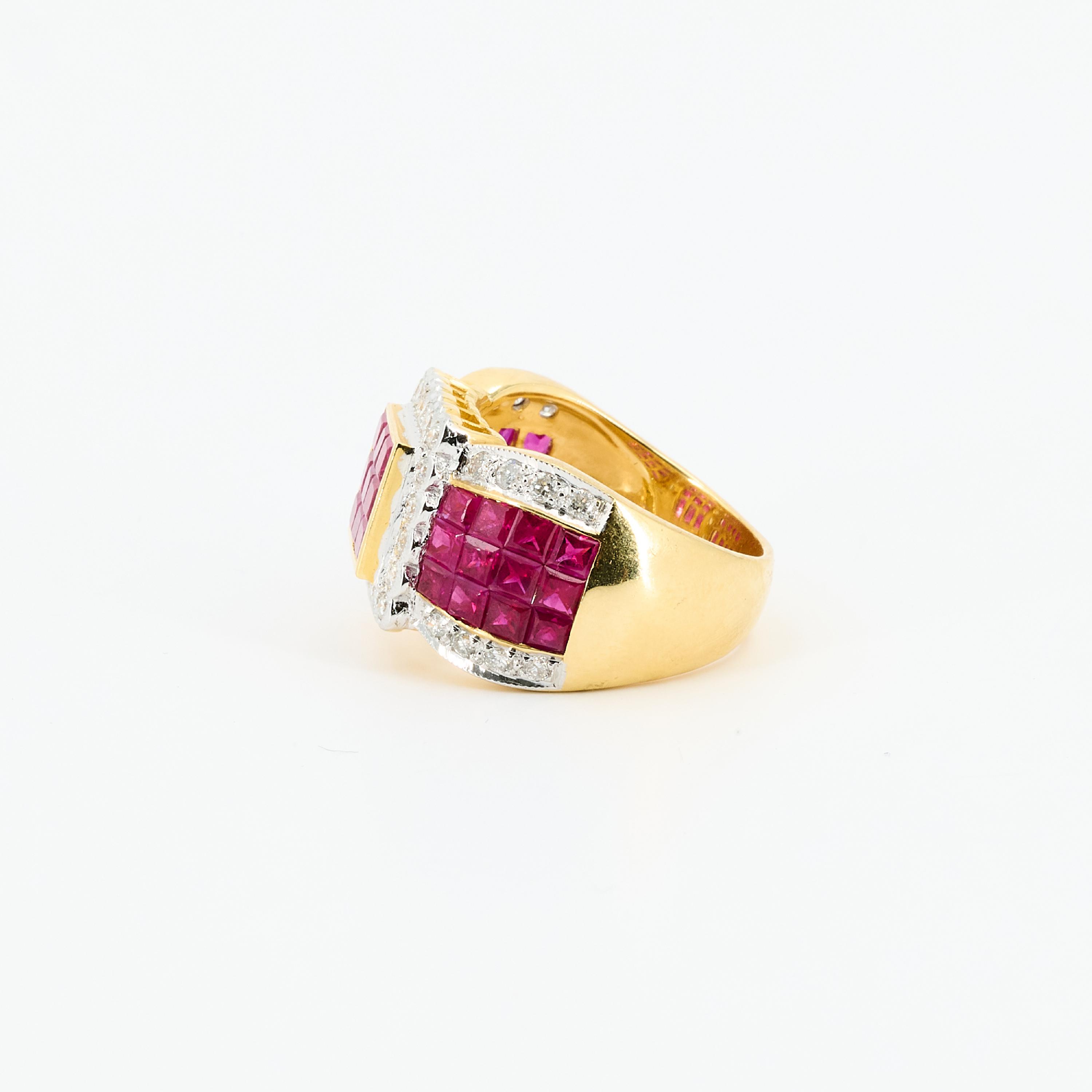 Beschreibung: Ein verspielt gestalteter Ring, die Anordnung der Rubine und Diamanten erinnert an die