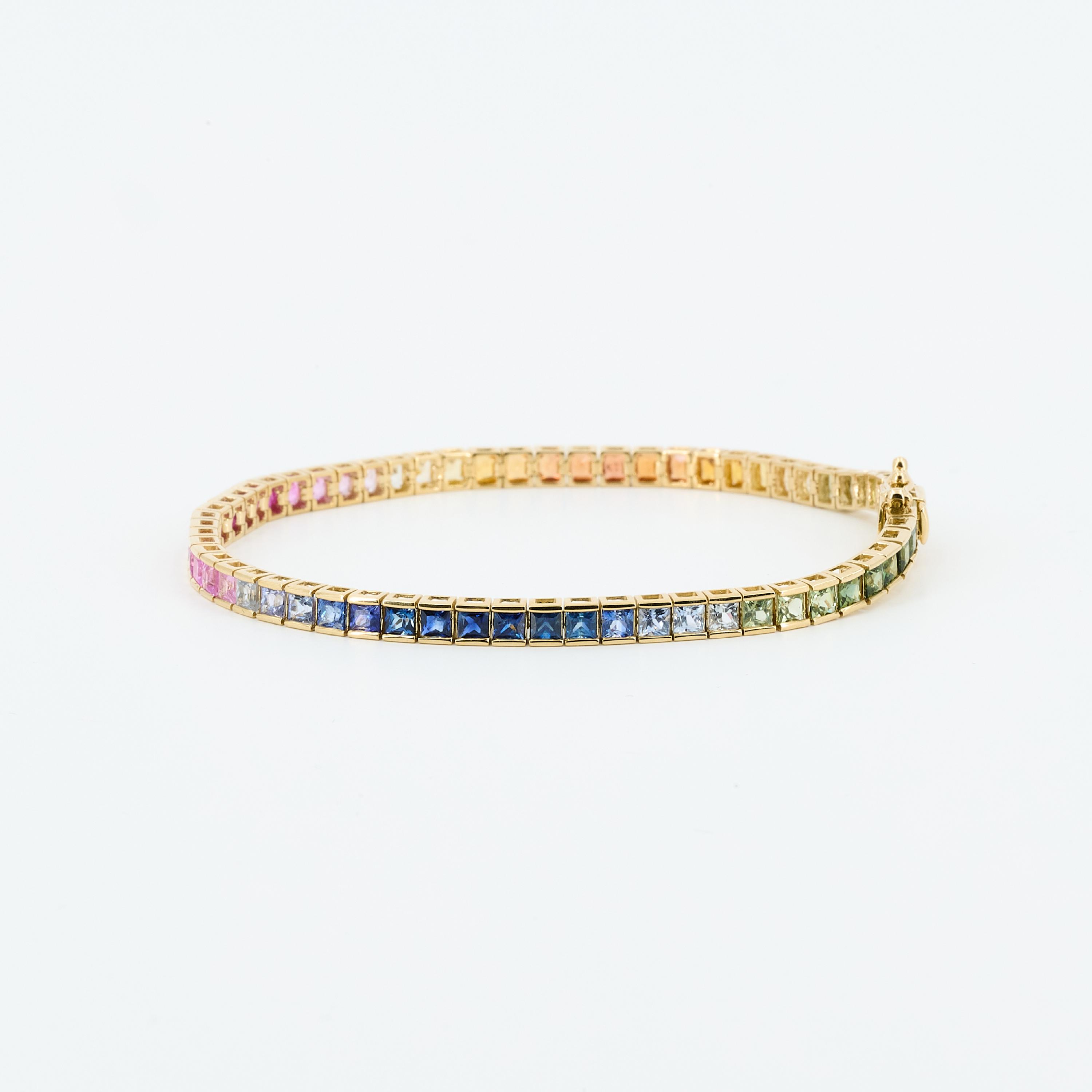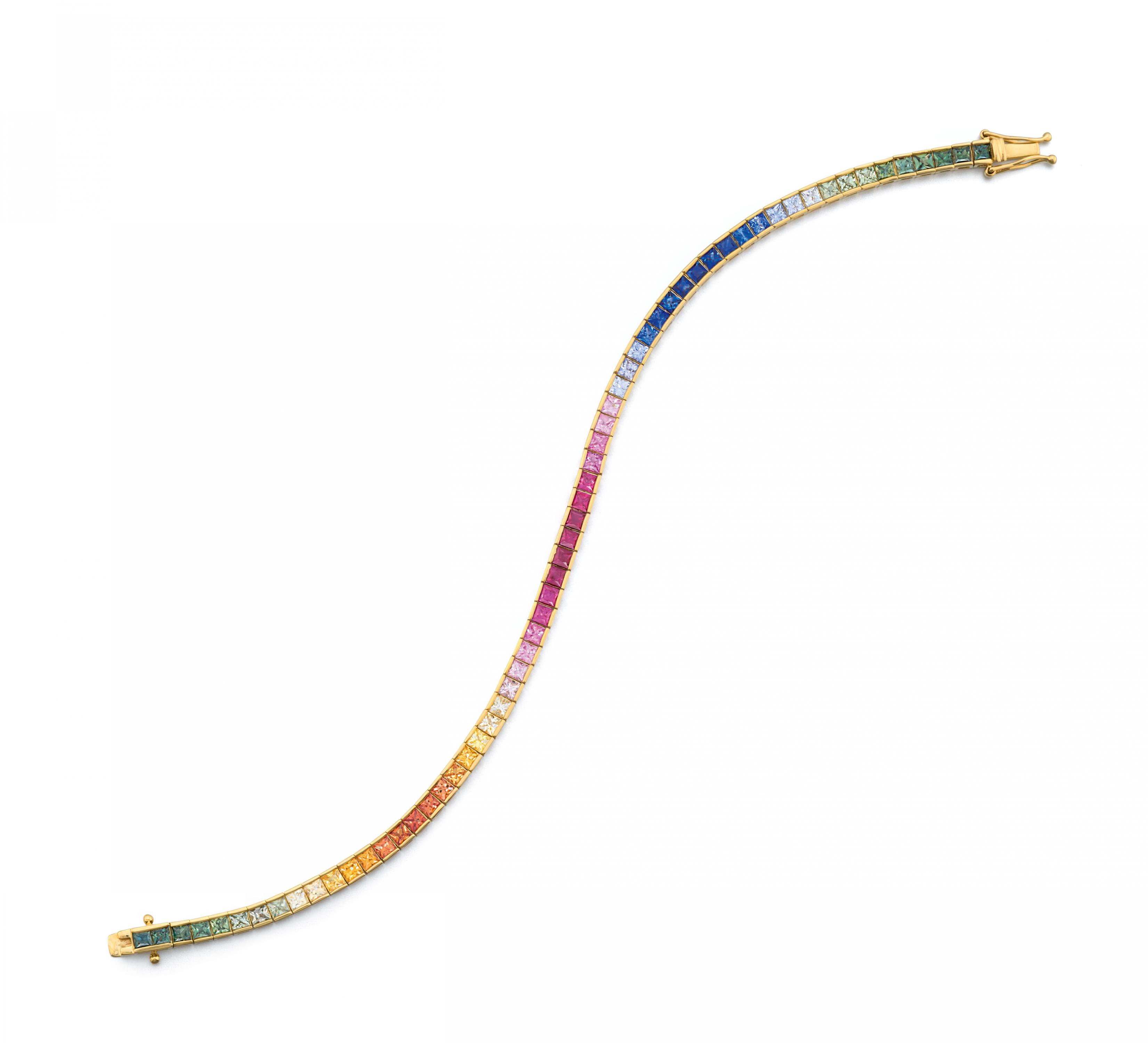 Edelsteine: 63 Saphire im Karree-Schliff zus. ca. 8,7 ct., in fancy Regenbogenfarben.