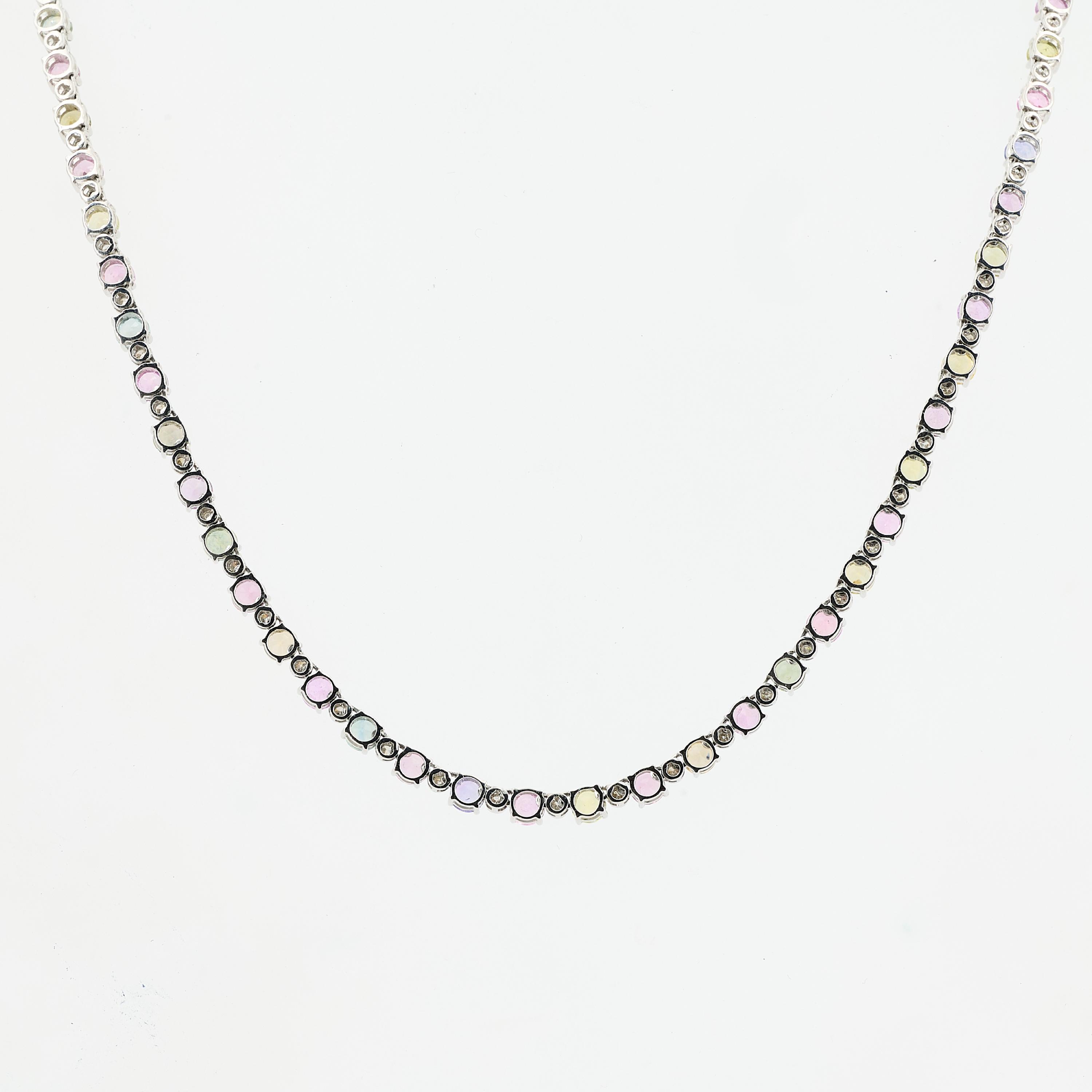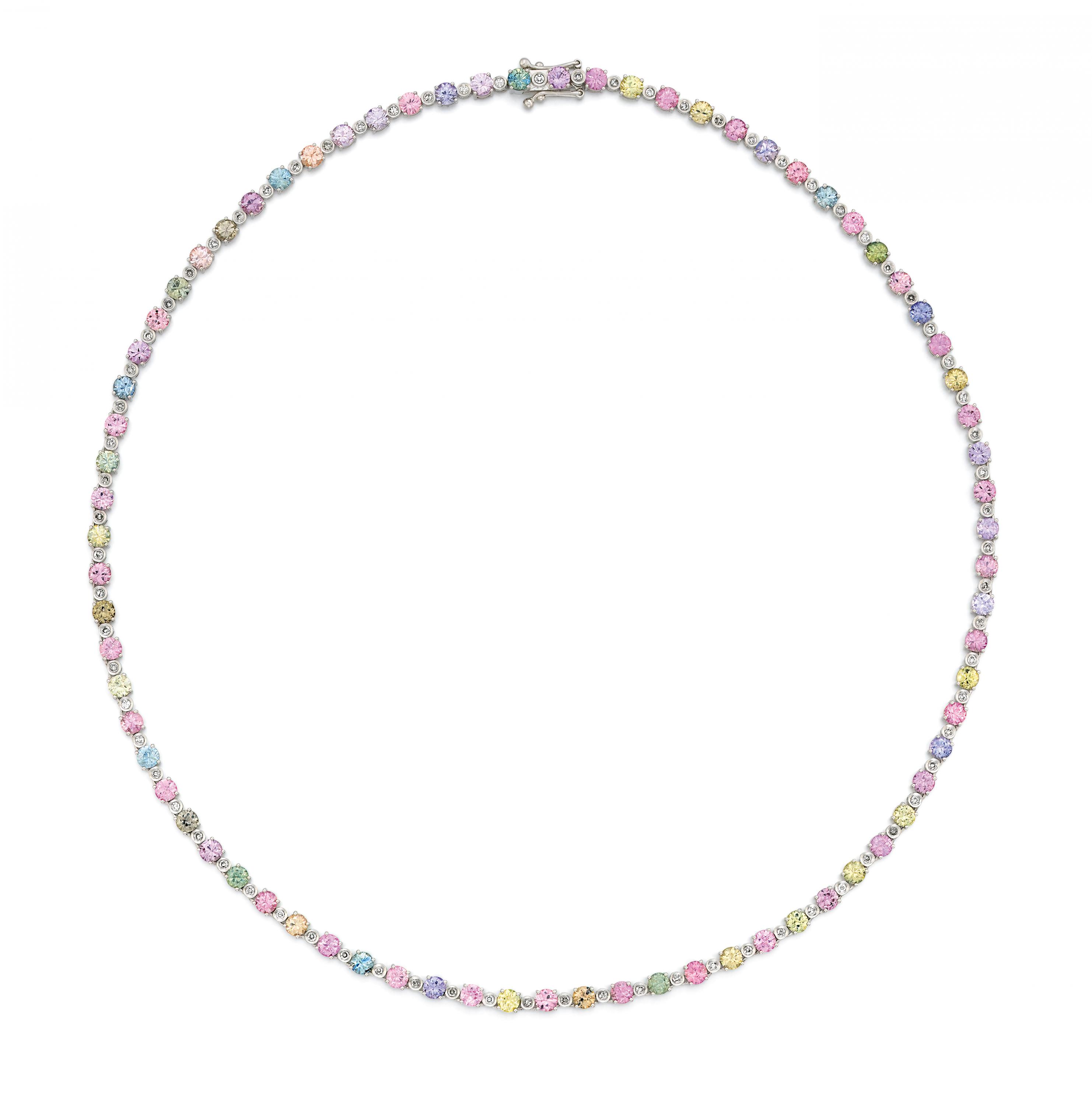 Edelsteine: 75 runde, facettierte Saphire zus. ca. 11,7 ct., feine Pastelltöne von rosa, grün bis blau.
