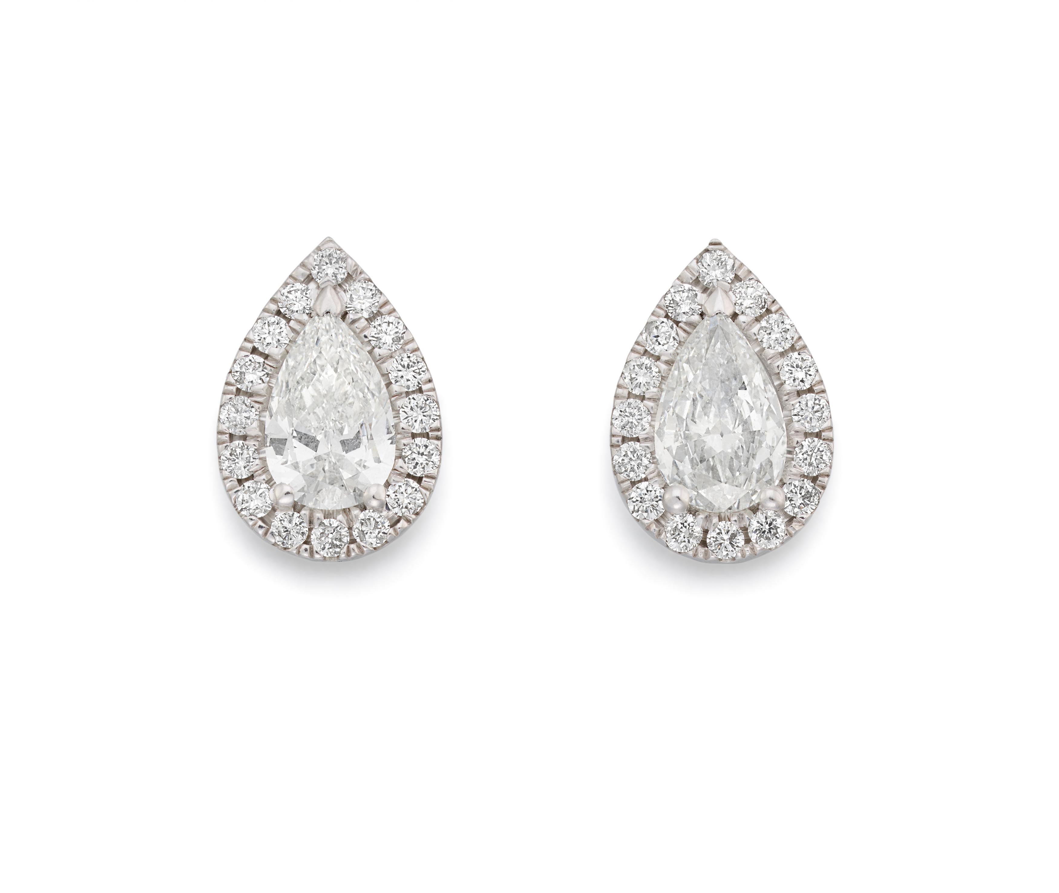 Diamanten: 2 Diamanten im Tropfen-Schliff zus. ca. 1,8 ct., G/VS, 32 winzige Brillanten zus. ca. 0,3 ct.