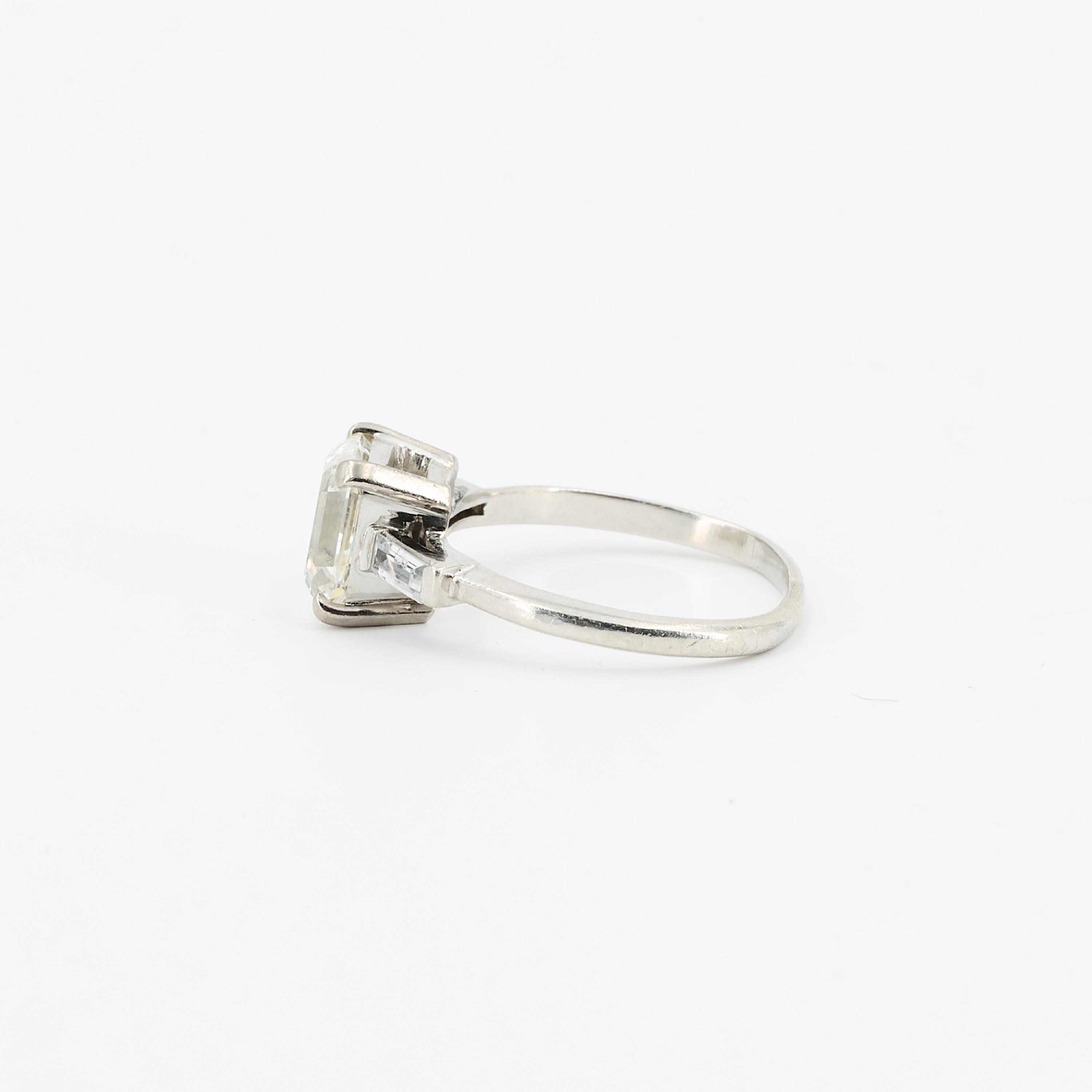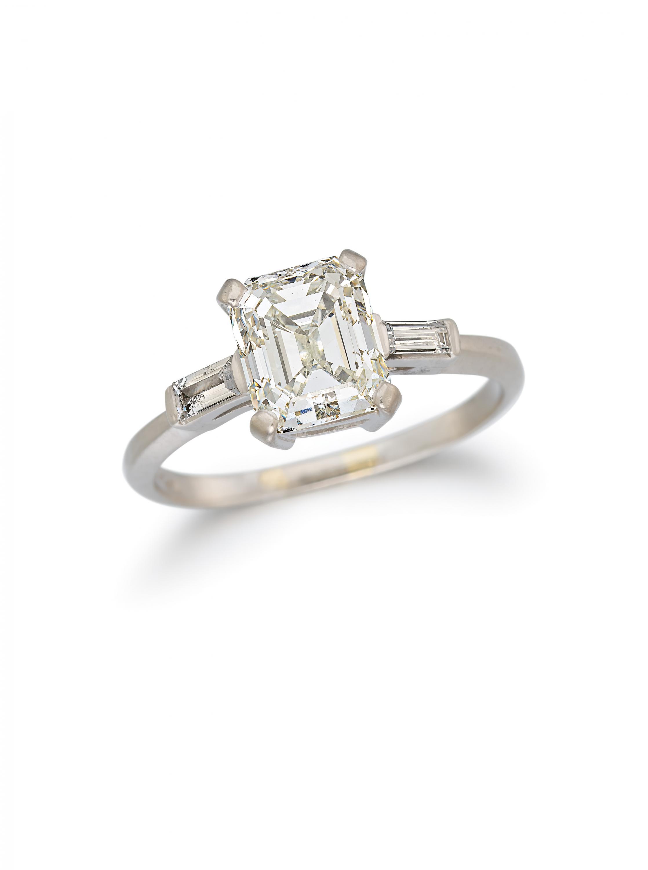 Diamanten: 1 Diamant im Emerald-Schliff ca. 2,2 ct., J/VS, flankiert von 2 Diamanten im Baguette-Schliff zus. ca. 0,1 ct., H/VS.