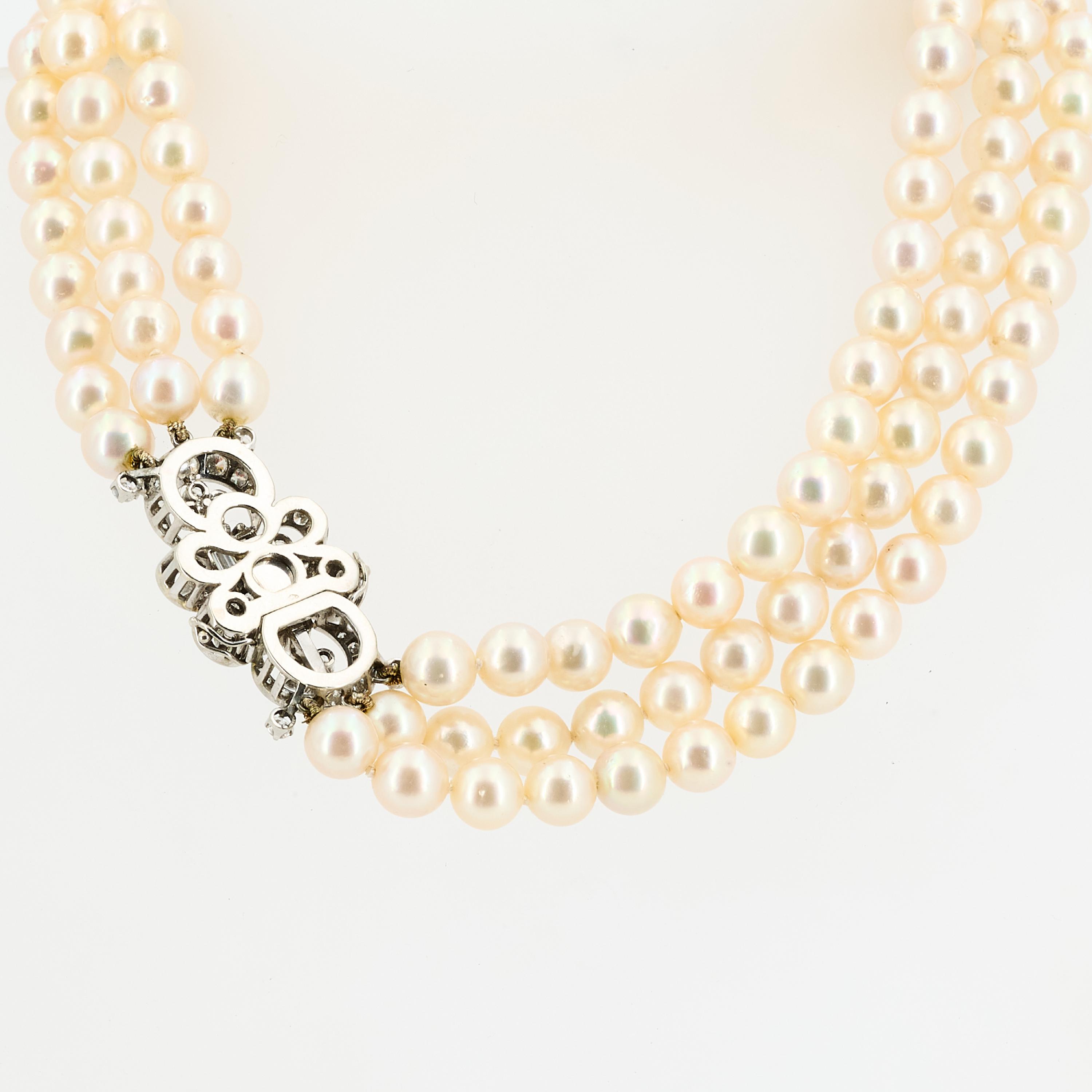 DREIREIHIGES AKOYAPERL-COLLIER MIT DIAMANT-SCHLIEßE.