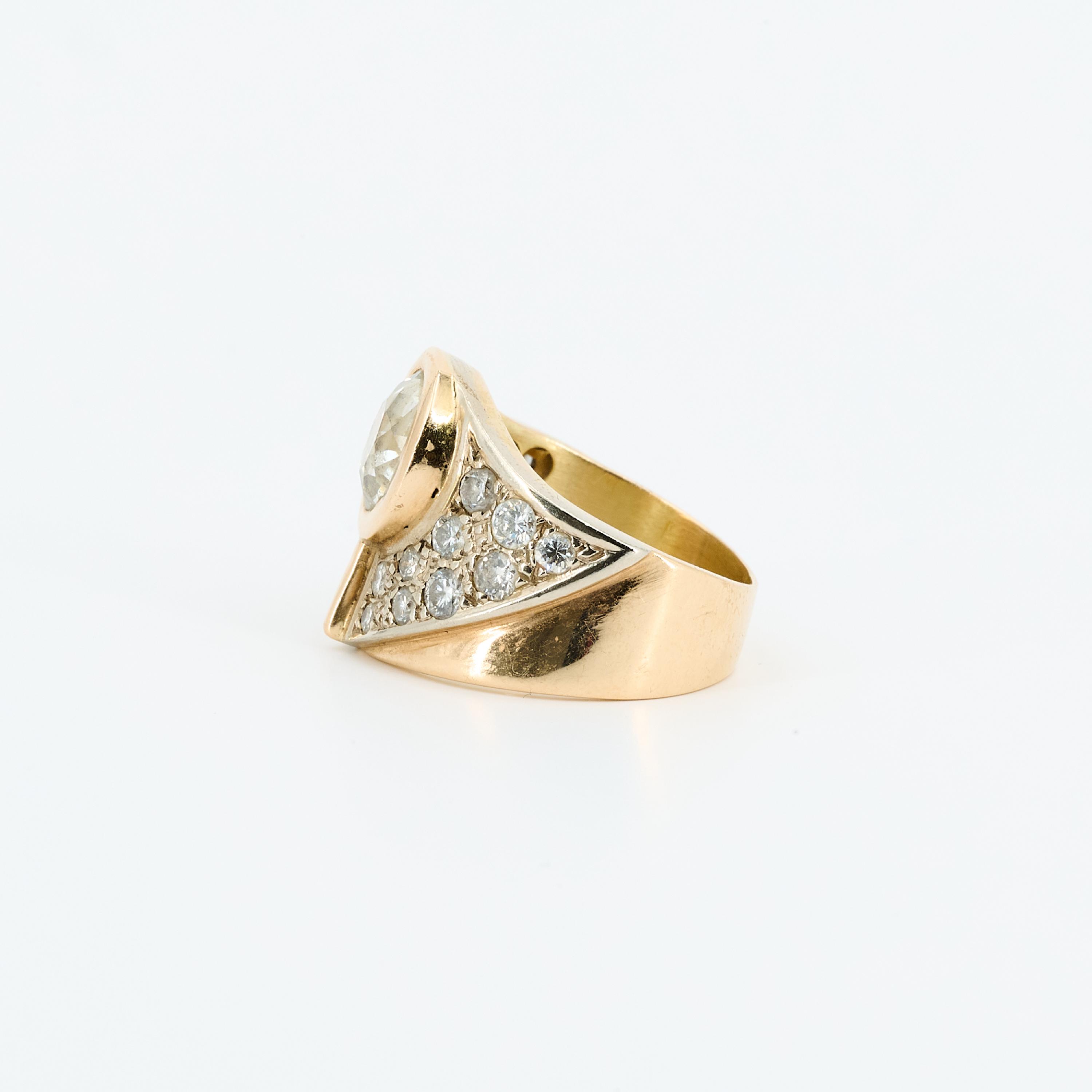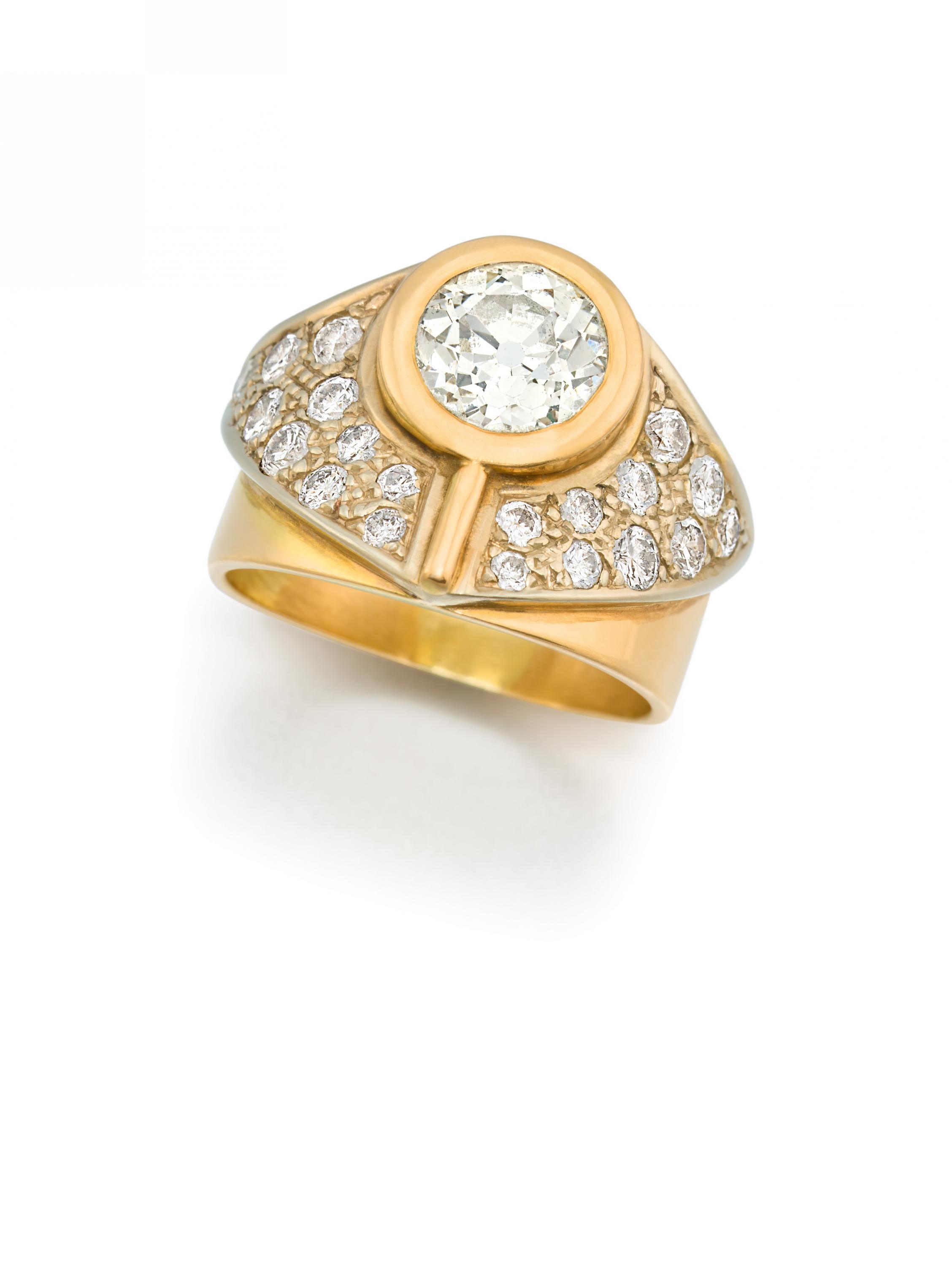 Diamanten: 1 Diamant im Alt-Schliff ca. 2,1 ct., N-O/SI2, 20 Brillanten zus. ca. 0,4 ct., I-J/SI.