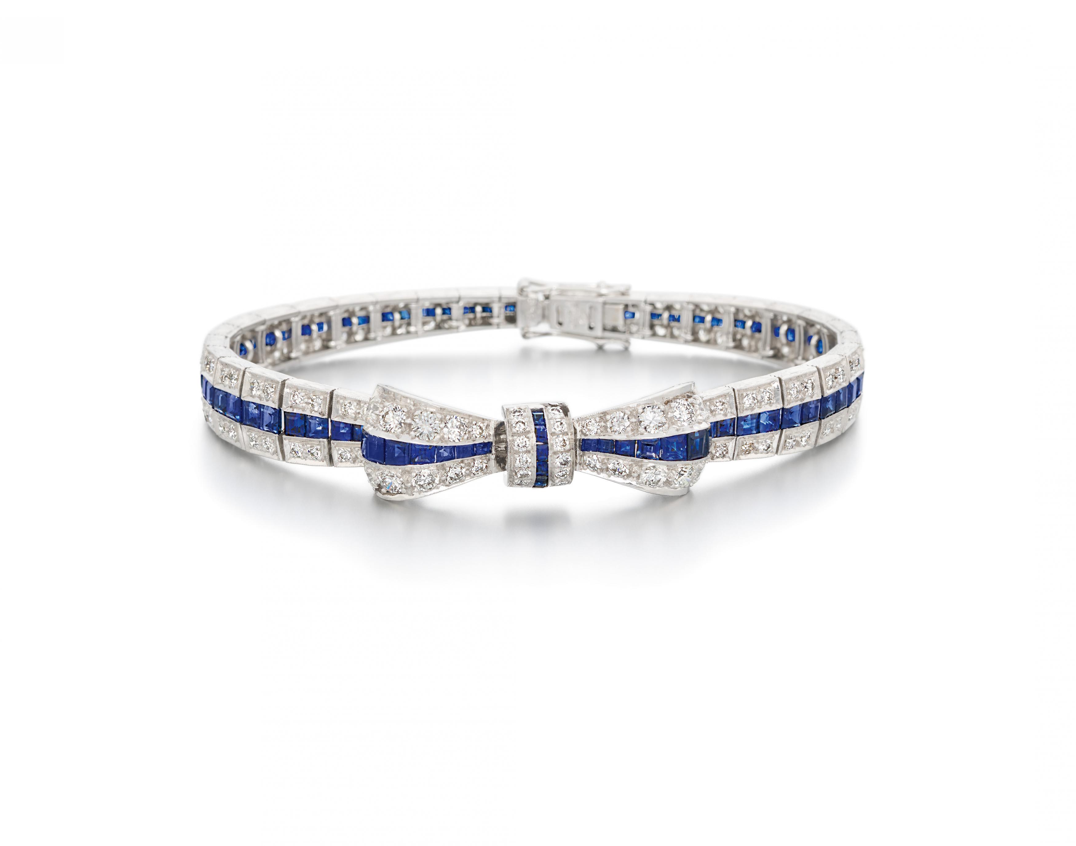 Beschreibung: Elegantes Schmuckarmband in Form einer Schleife, ein winziges Saphir-Karree fehlend.