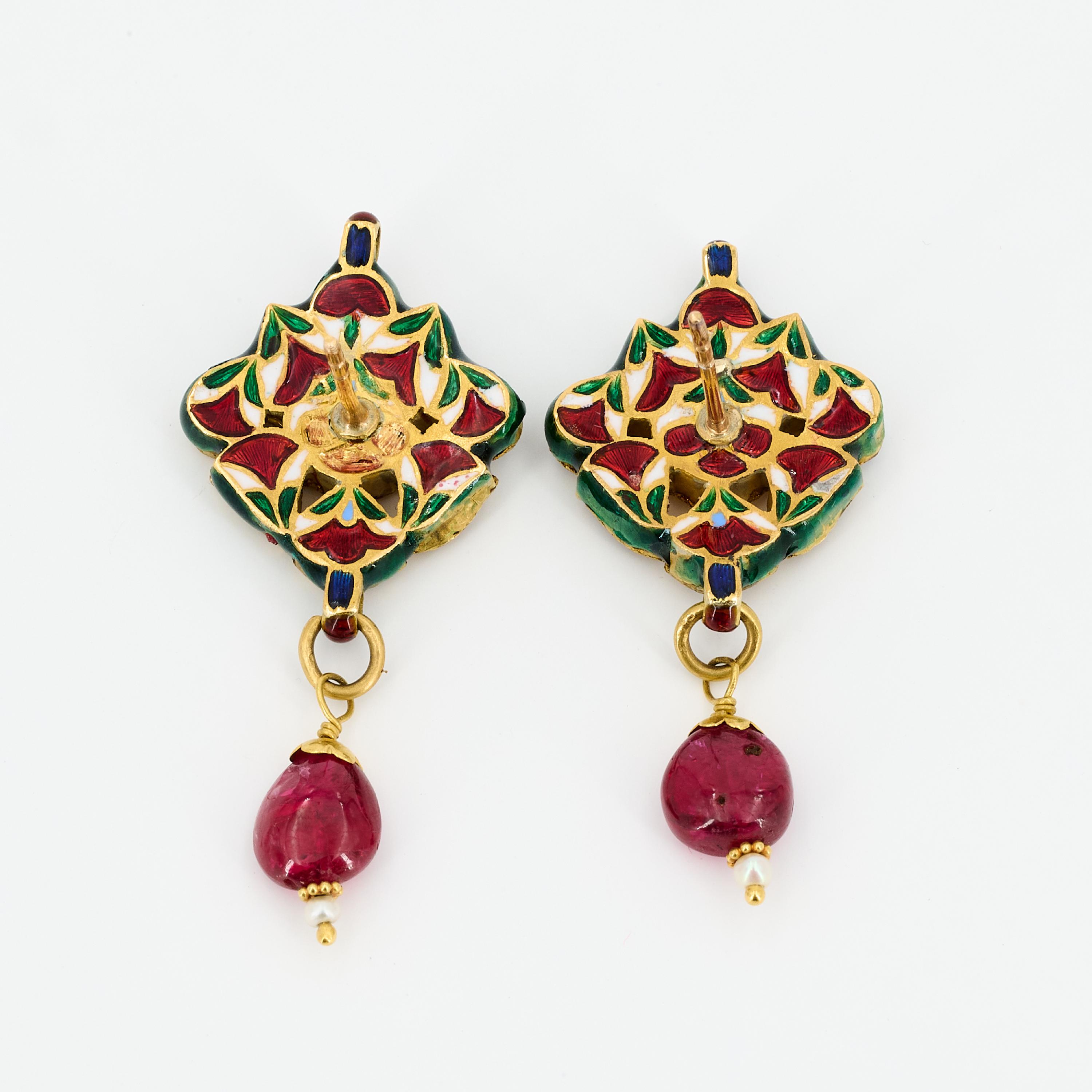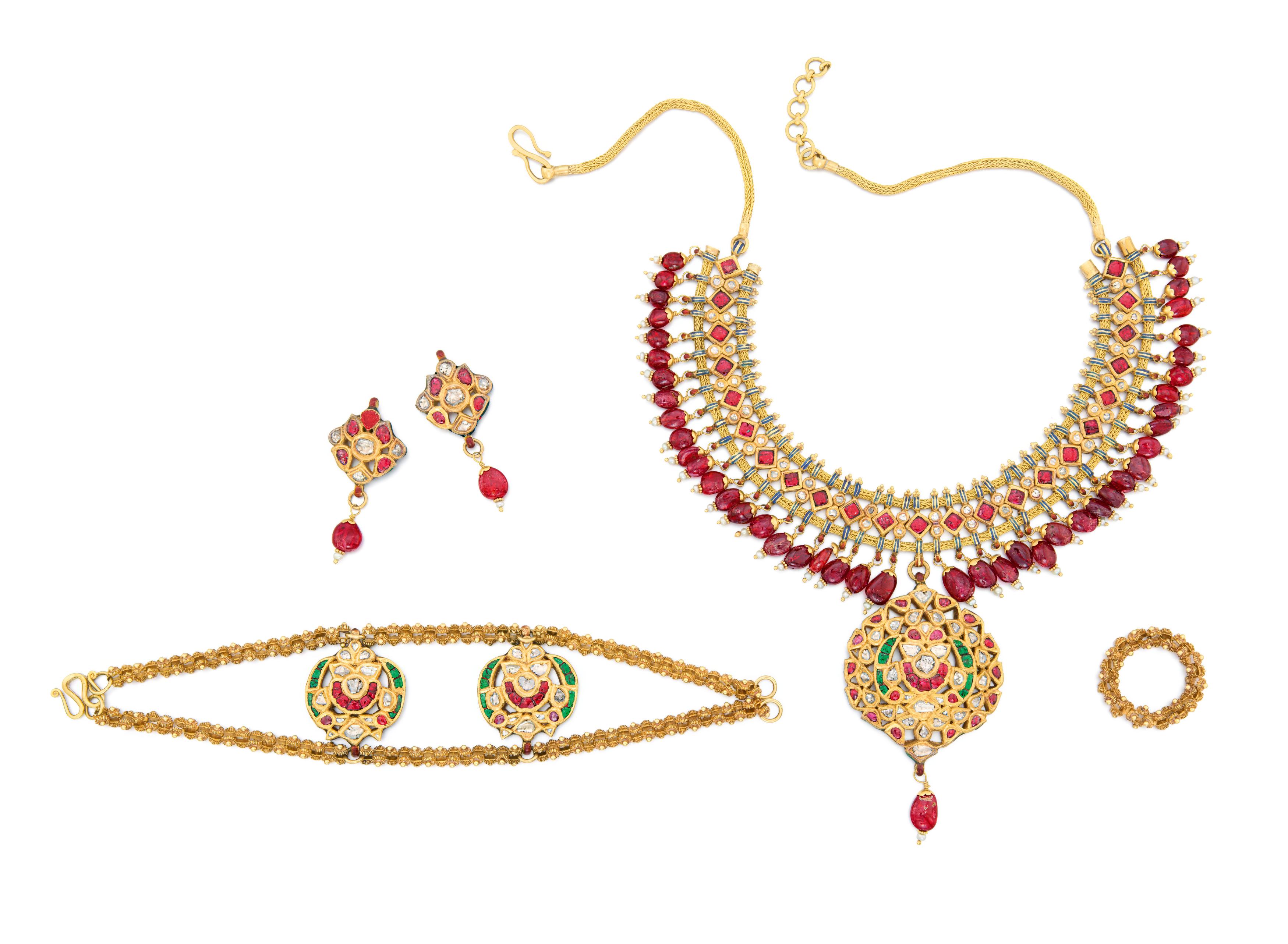 Beschreibung: Ein Diamant am Ohrschmuck fehlend. Detailreiches, typisch indisches Schmuckset.