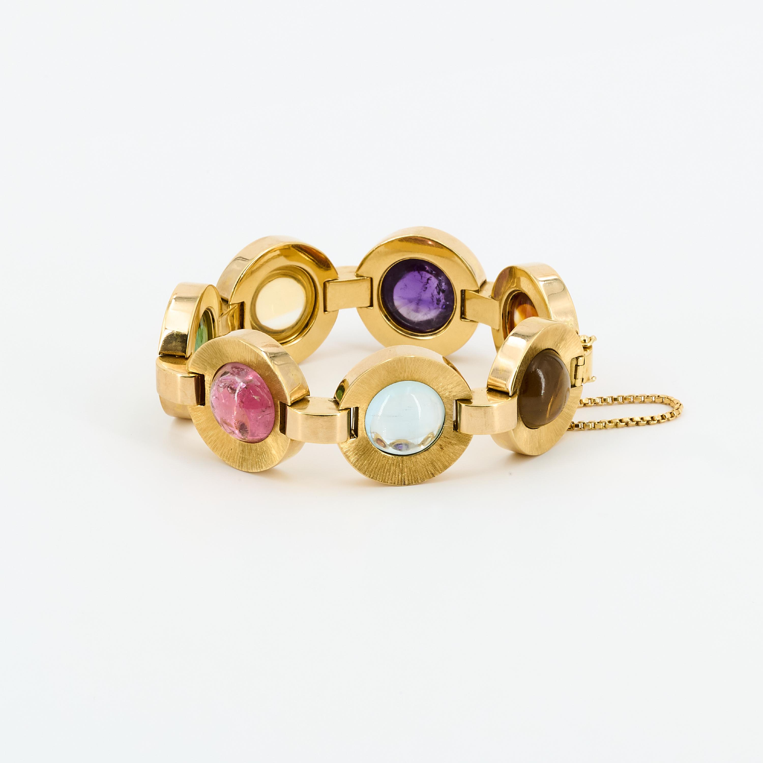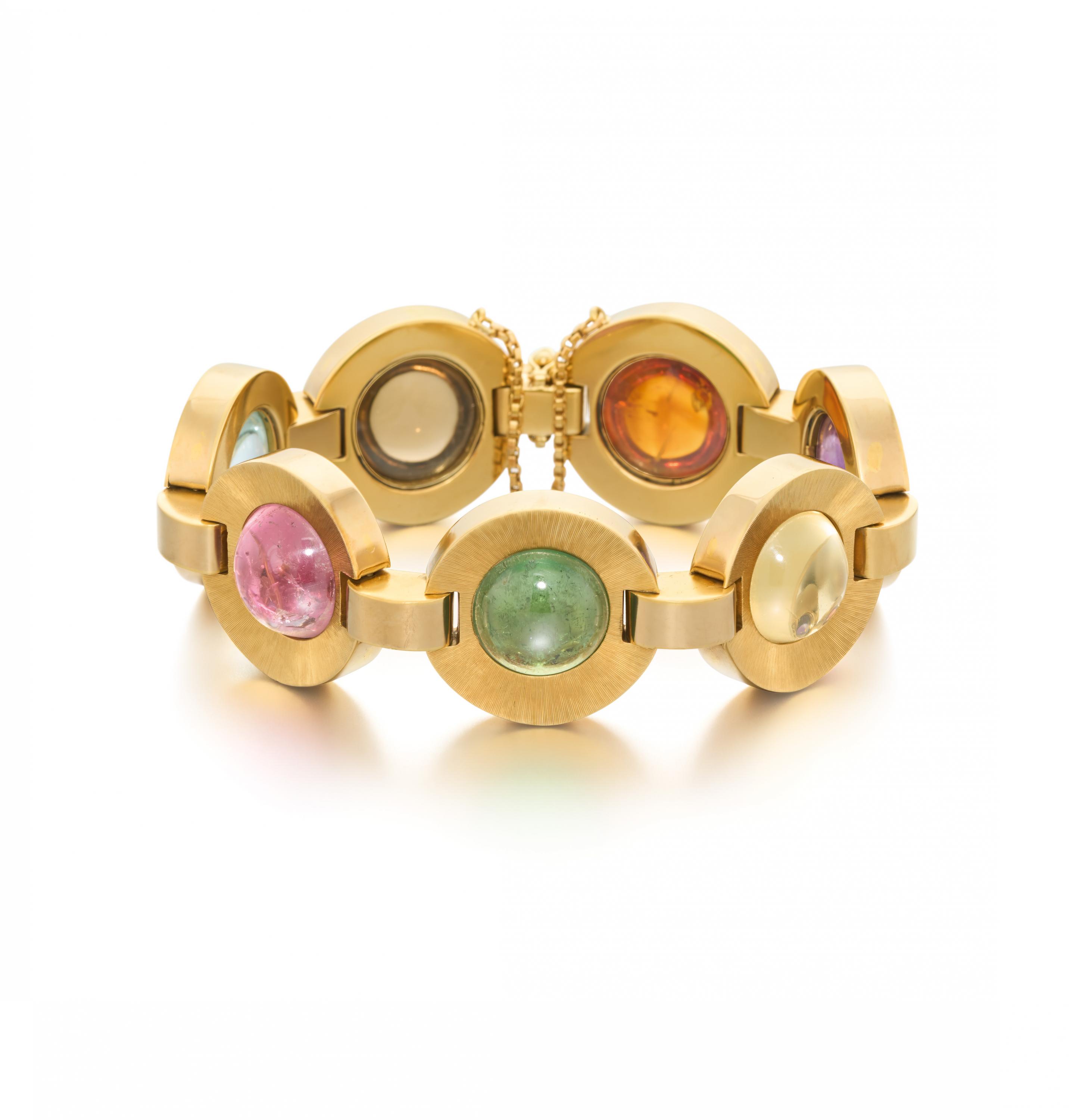 Edelsteine: 7 runde Farbsteine im Cabochon-Schliff, darunter Turmalin, Amethyst, Citrin und andere Quarze, zus. ca. 77,0 ct.
