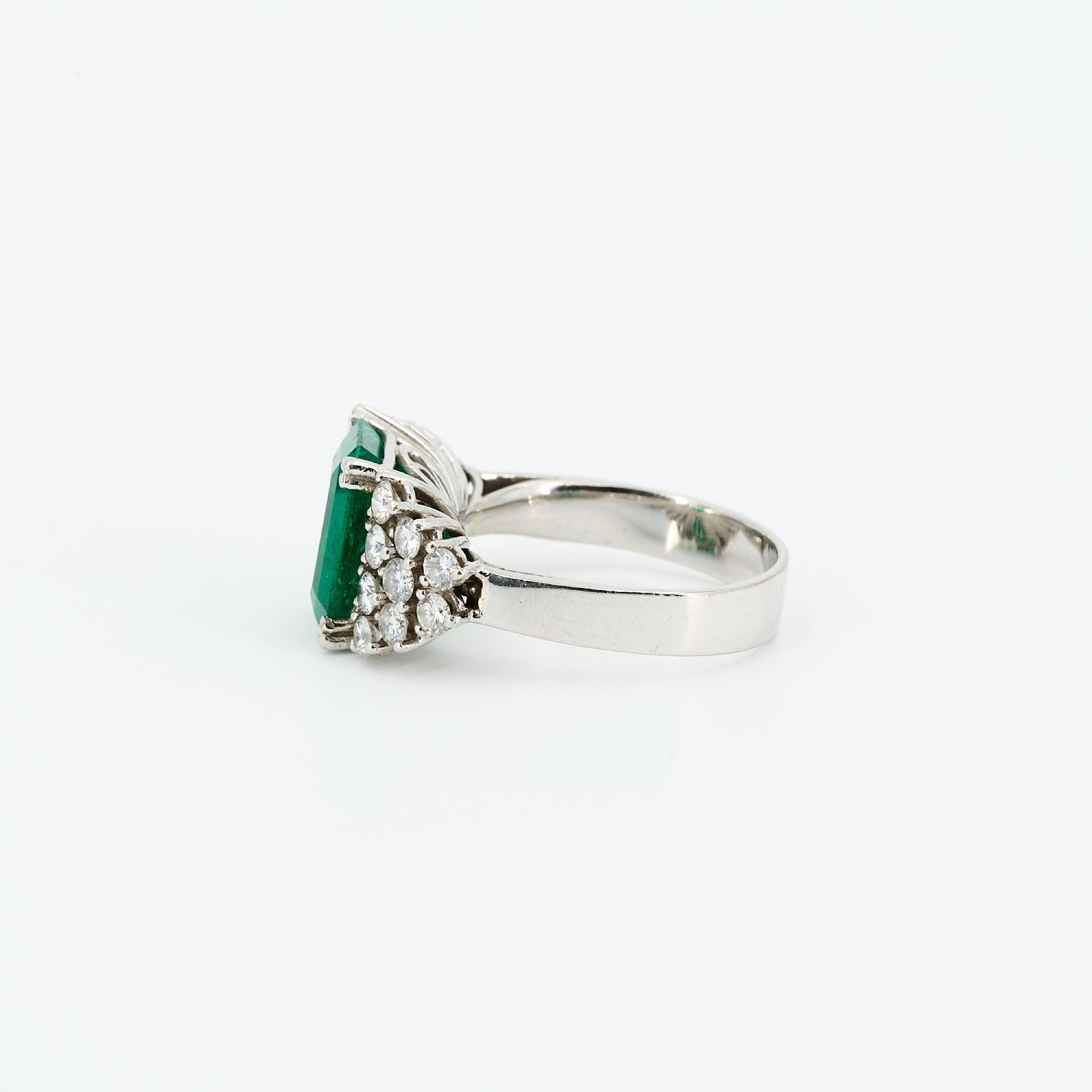 Beschreibung: Klassischer Ring mit einem Smaragd in dunklem, sattem Grün, flankiert von Diamanten.
