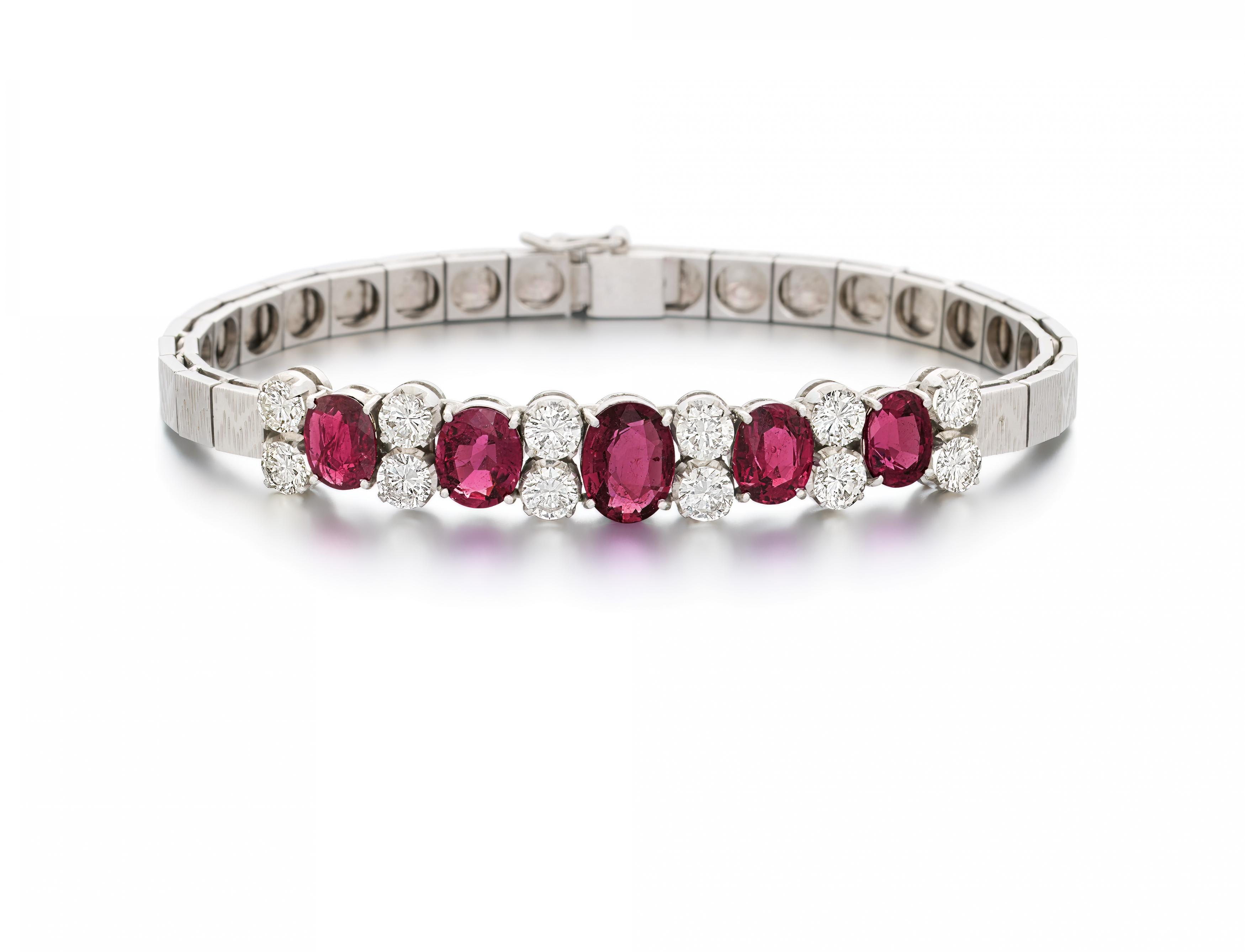 Edelsteine: 5 ovale, facettierte Rubine, zus. ca. 5,2 ct., violettstichig, transparent.