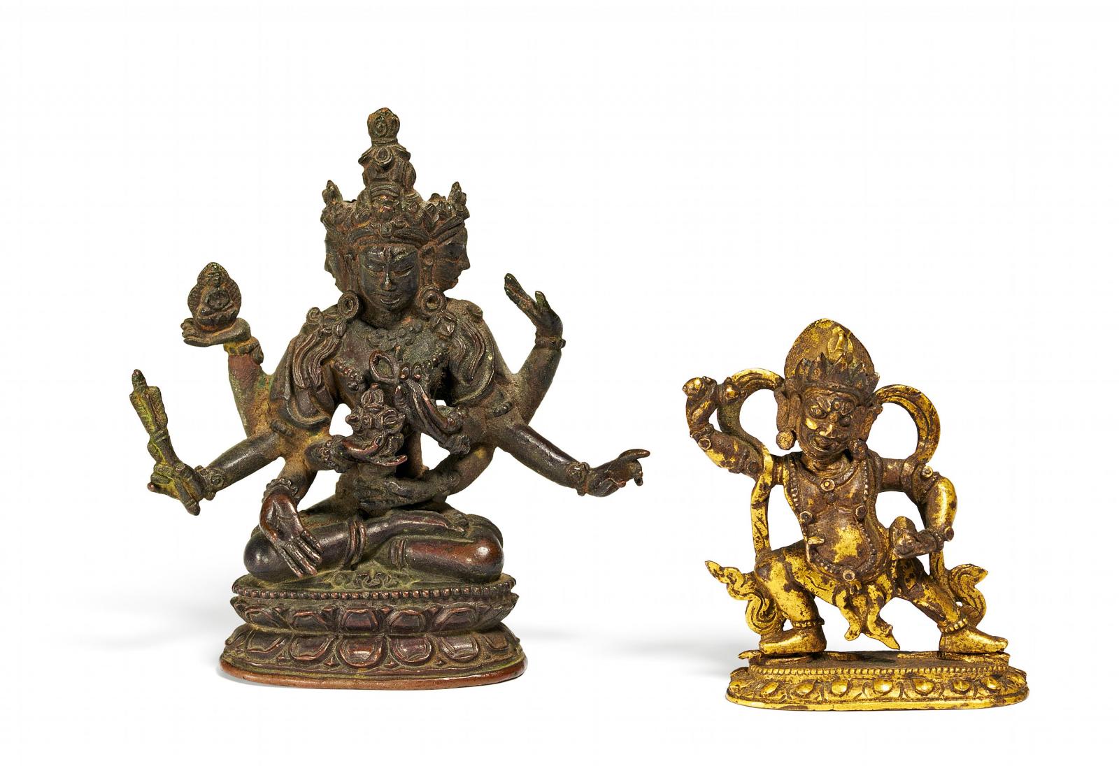 b) Vajrapani in der selten gezeigten Emanation als Nilambara-Vajrapani ohne Schädelkrone und Schädelkette. Feuervergoldete Bronze mit Resten kultischer Bemalung. Die zornvolle Gottheit stehend auf einem schmalen Lotossockel, in der erhobenen rechten Hand hält er einen vajra und mit der linken auf Hüfthöhe eine Glocke. Um die Hüften trägt er ein Tigerfell und auf seiner Brust Schlangenornamente. Sockel separat gearbeitet. Gewicht 31g, Höhe 4,5cm.