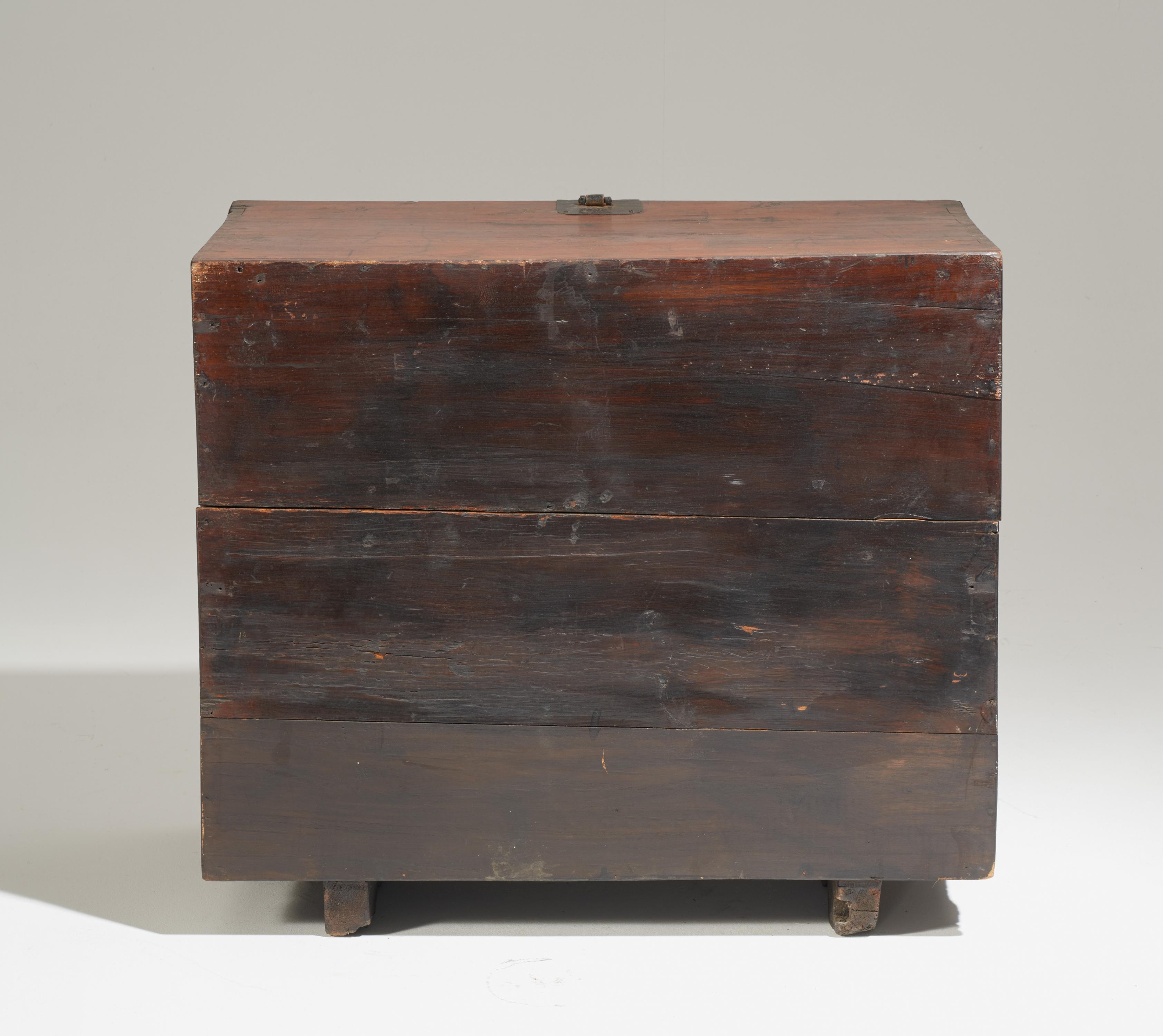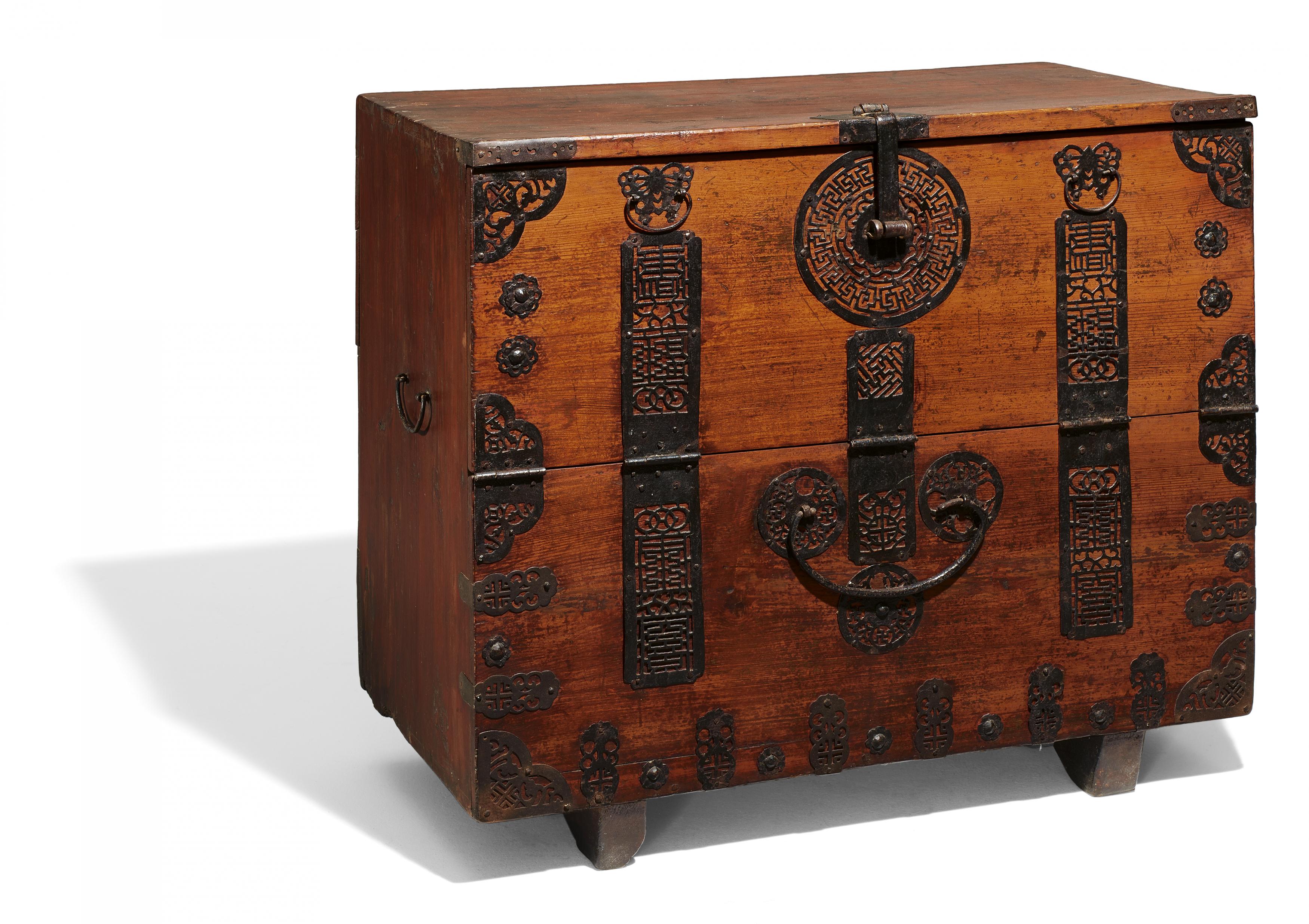 Technik: Nadelholz mit filigranen Eisenbeschlägen. Steckschloss aus Eisen.