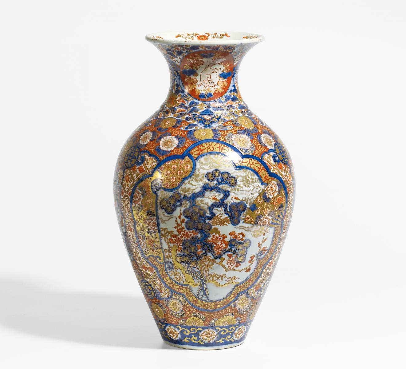 Technik: Arita-Porzellan, dekoriert in Unterglasurblau und in Aufglasur mit Eisenrot und Gold.