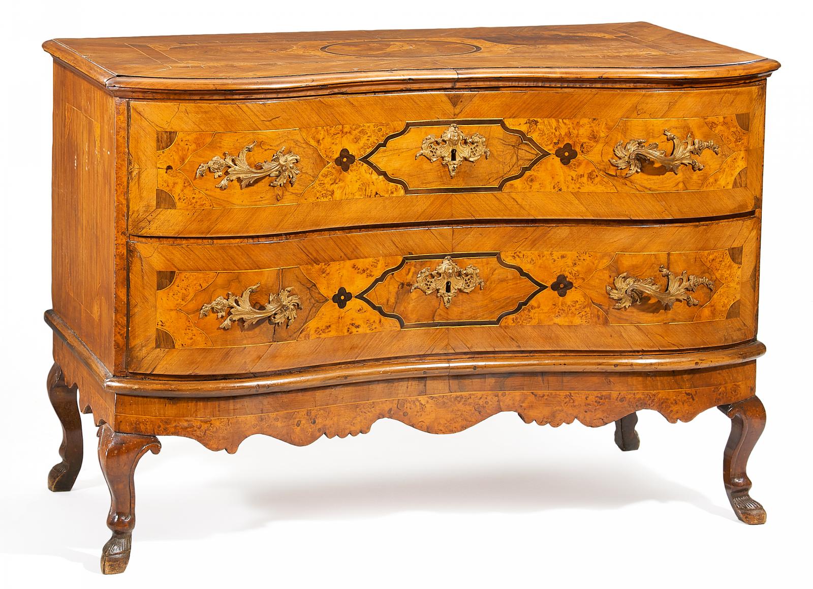 Nussbaum, Ahorn, Ahornmaser, Ebenholz eingelegt. Zweischübiger doppelt geschweifter Korpus mit Bandeinlagen auf Huffüßen. Auf der