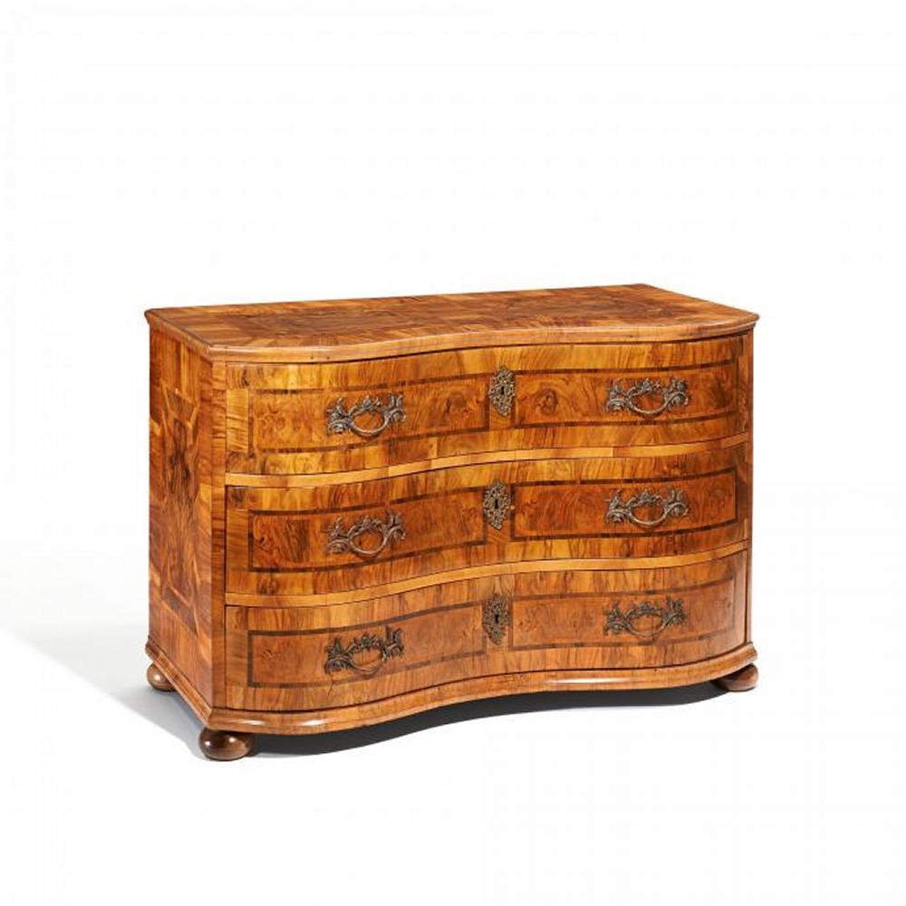 Nussbaum und Nussbaummaser poliert und eingelegt. Dreíschübiger Korpus mit Bandelwerkeinlagen. 83x124x63 cm. Zustand C.