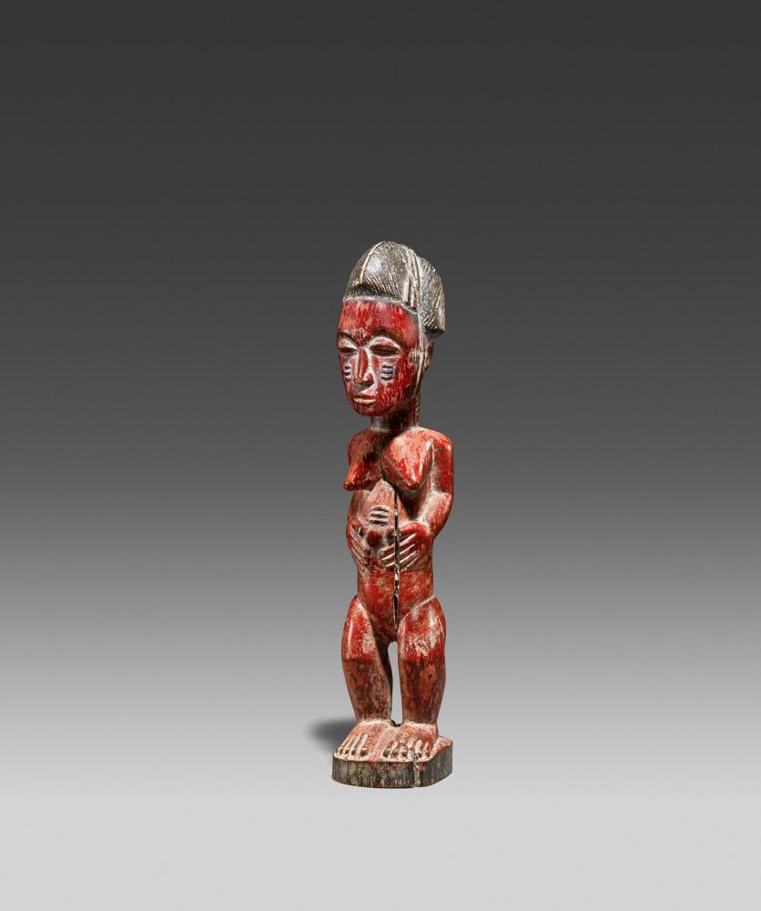 Deutliche Spuren des rituellen Gebrauchs sind an der teils abgegriffenen roten Bemalung dieser weiblichen Baule-Figur abzulesen. Hierdurch erhält sie einen eigenen Charm und Ausdruck. Das markant gezeichnete Gesicht mit den deutlichen Ziernarben auf den