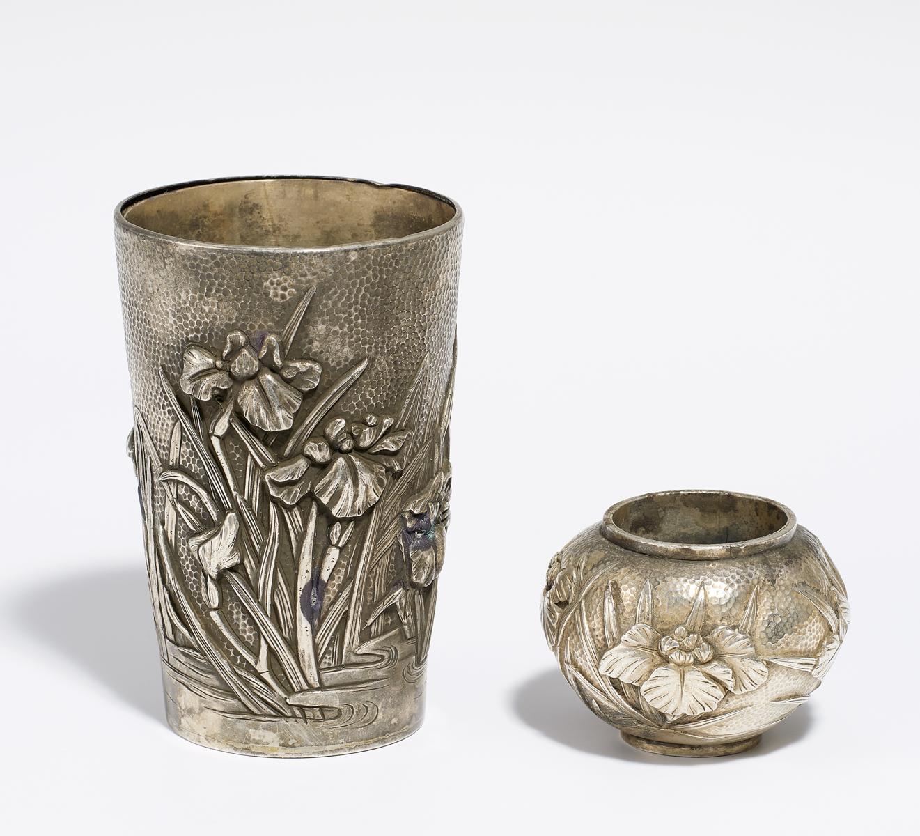 Beschreibung: Auf dem Becher in feinem Relief Schwertlilien im Wasser auf punziertem Fond.