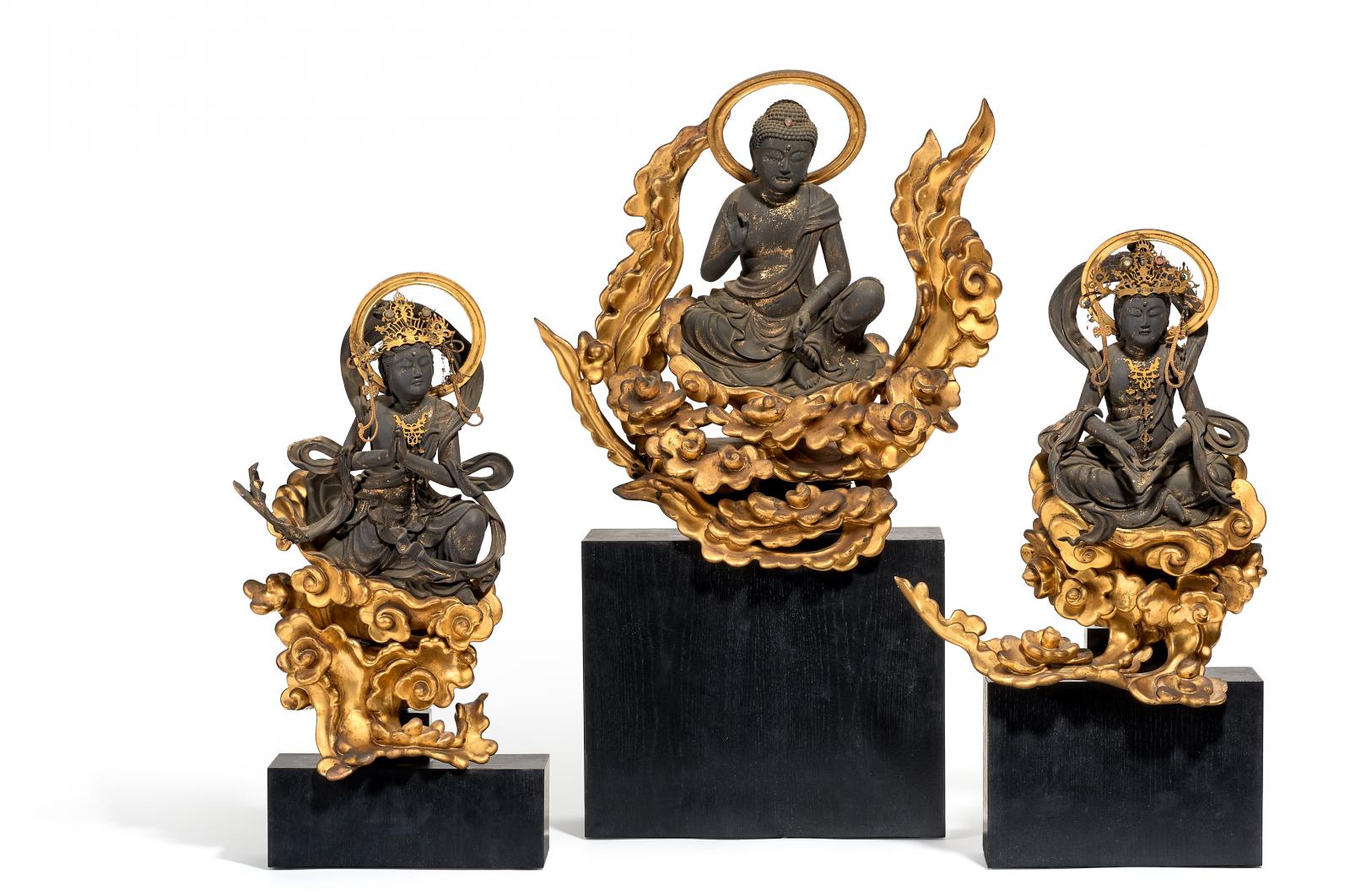 BEDEUTENDE AMIDA SANZON RAIGÔ-GRUPPE. BLATTVERGOLDETES HOLZ.