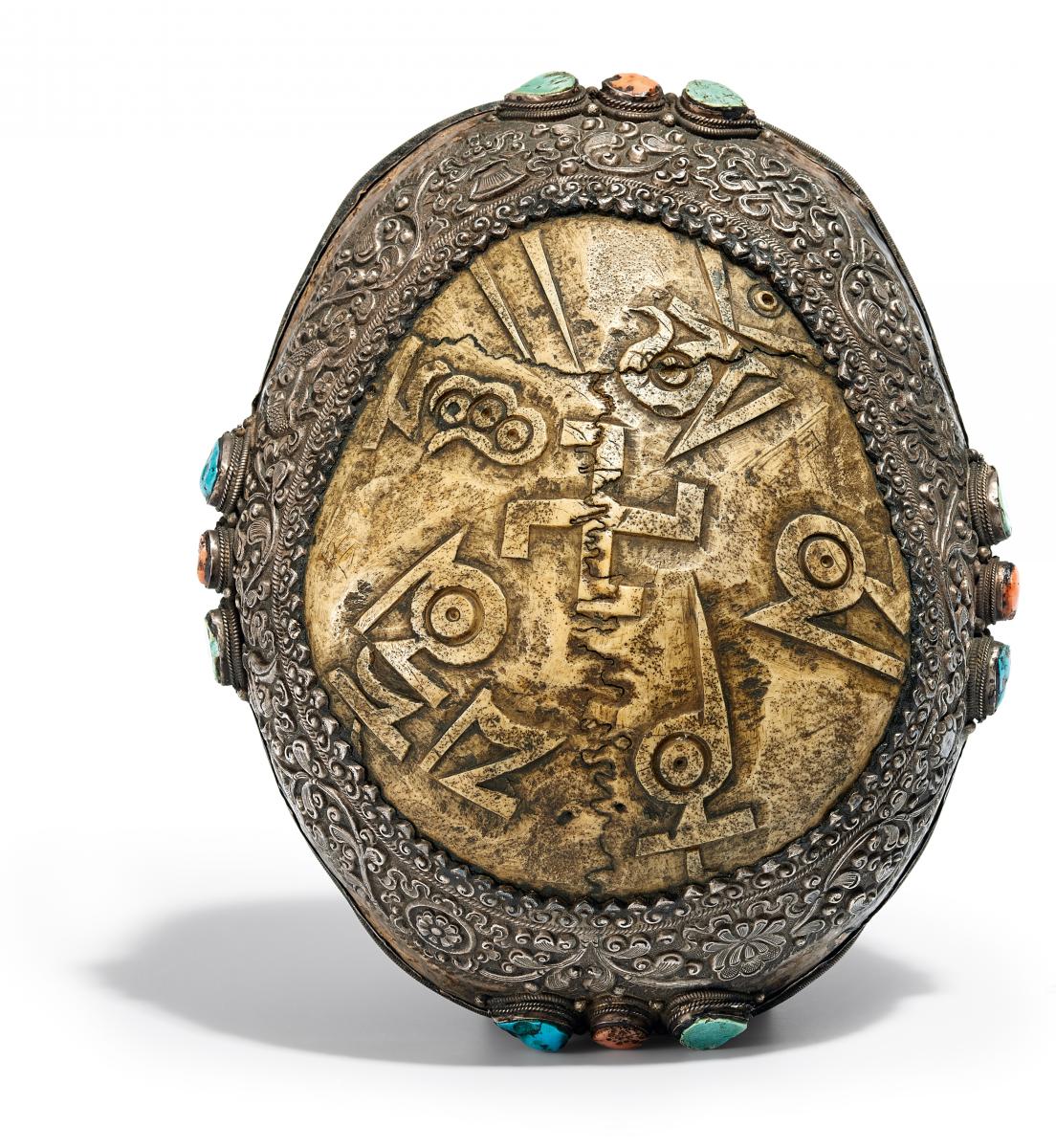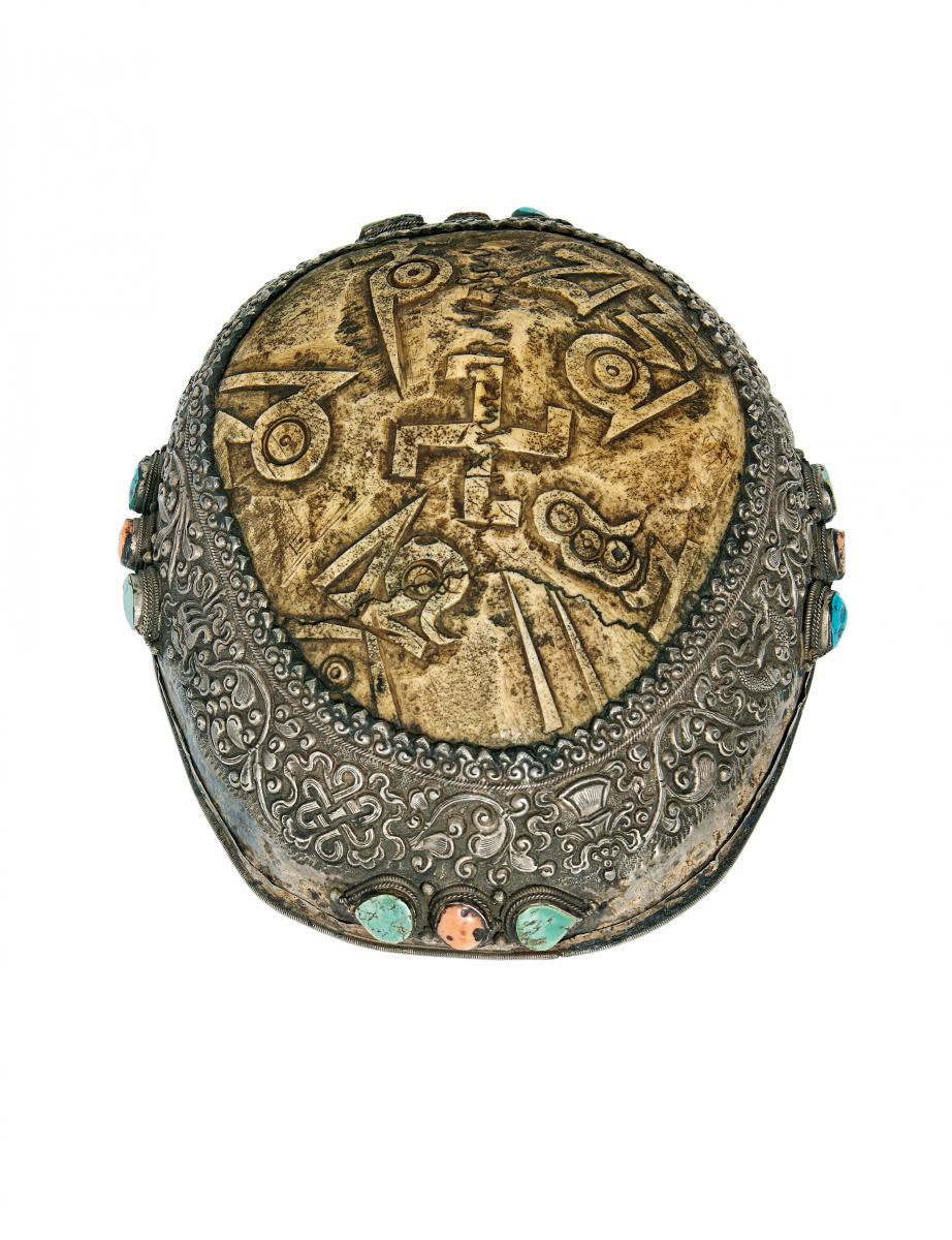 Beschreibung: Die Schale besteht aus der Schädelkalotte eines hohen Lamas. Sie wurde in flachem Relief beschnitzt mit einem ungewöhnlicherweise linksdrehenden swastika und den Silben omani padma hum. Rechts und links der Pfeilnaht finden sich im hinteren Teil Spuren des Phowa-Rituals, das im Prinzip zur Vorbereitung des eigenen Todes gesehen werden kann.
