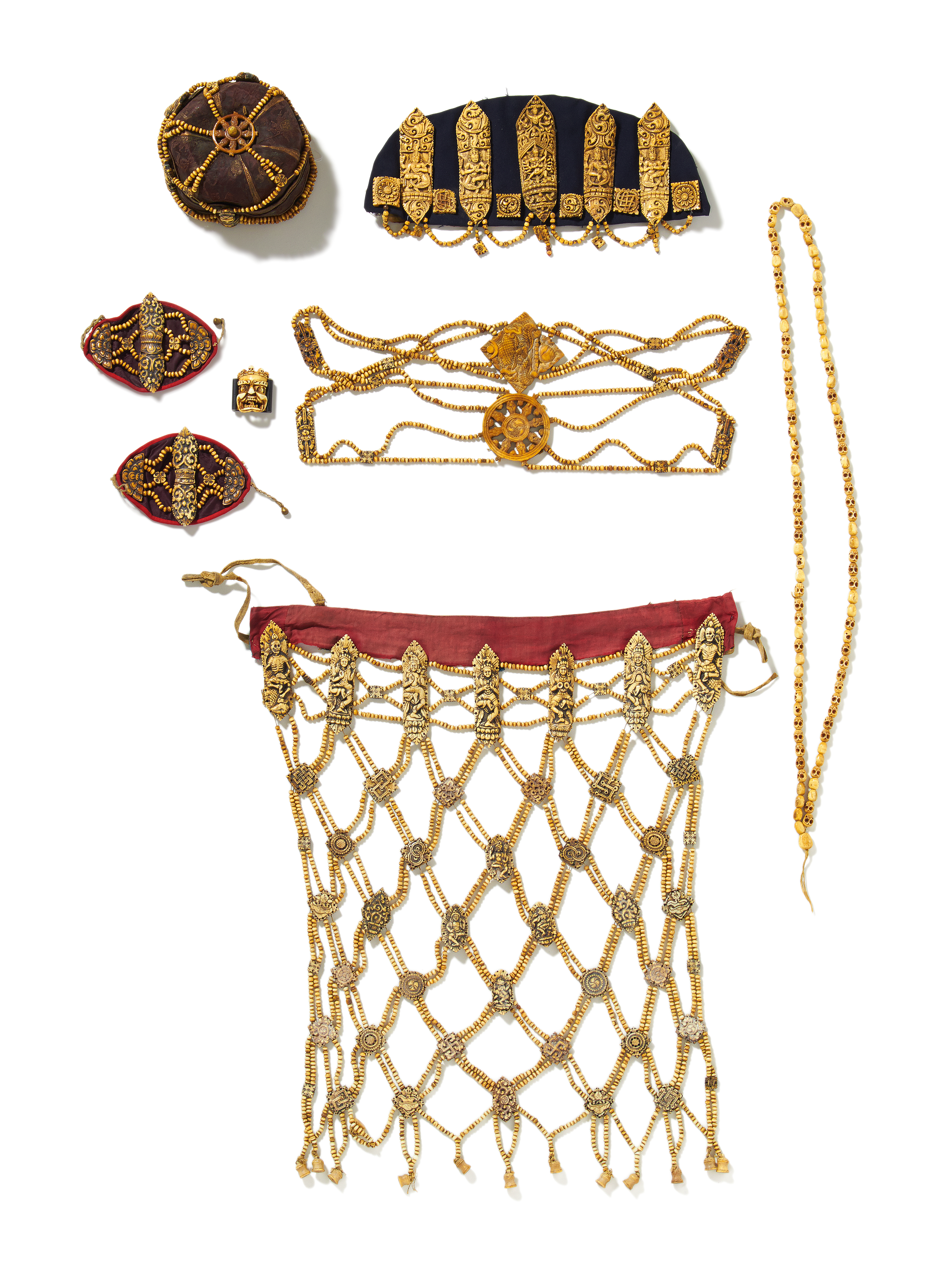 BEDEUTENDE KRONE UND WEITERE ZEREMONIELLE KNOCHENGEWÄNDER.