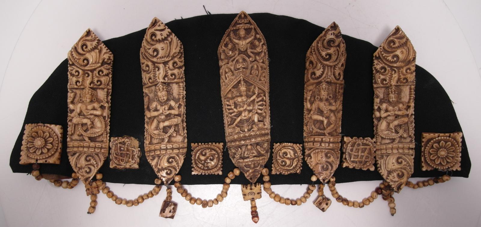 Beschreibung: a) Trantrische Krone aus fünf sehr fein geschnitzten Paneelen mit Kalachakra und tanzenden