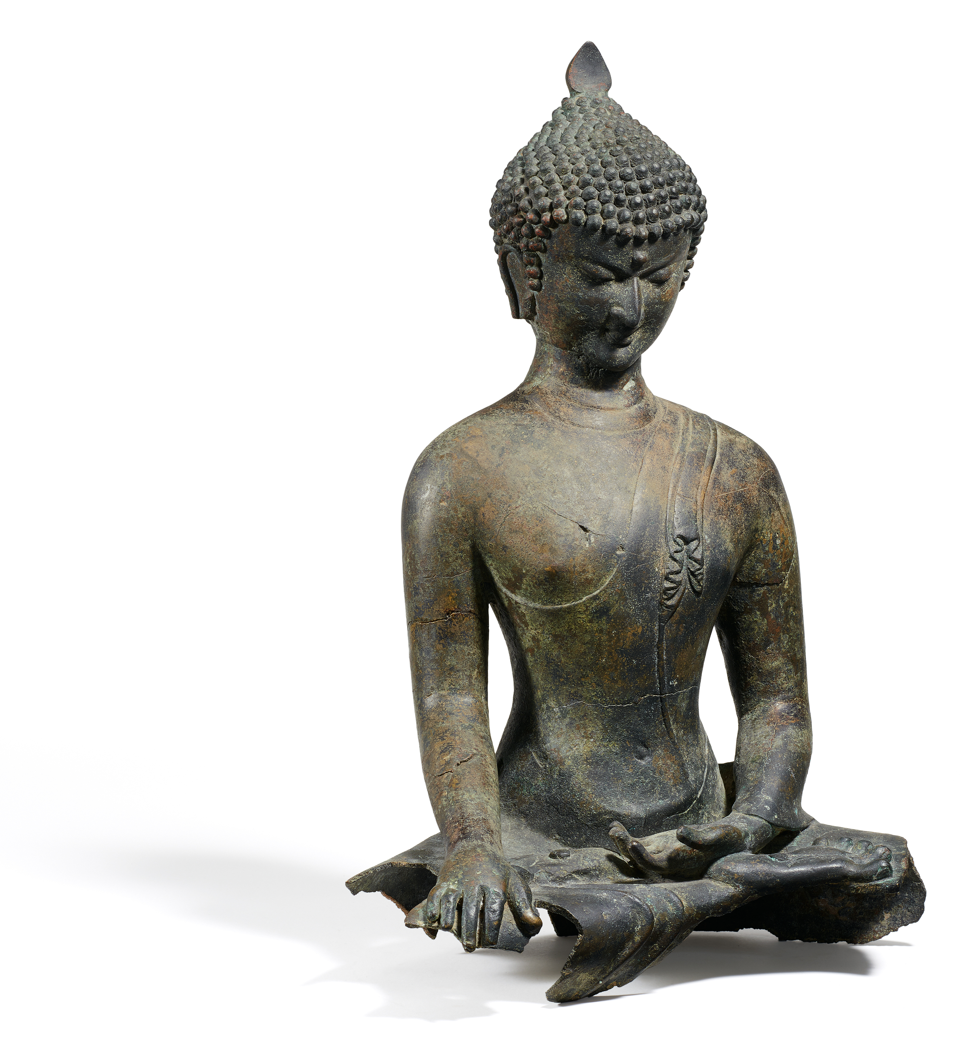 Beschreibung: Der Buddha in Lotoshaltung ist elegant gestaltet und zeigt den Einfluss der Kunst nach der Pala-Zeit Indiens. Das Antlitz in einem leichten Lächeln in sich gekehrt, die Hände lebendig und mit bewegten Fingern. Das dreiteilige kasaya-Gewand aus hauchdünnem Gewebe ist als feines Relief angedeutet mit Falten auf der linken Schulter, auf der Brust und dem Rücken. Ebenso die Säume als feine Relieflinien auf der Brust und entlang der Beine. Die Haare sind als kleine Erhebungen stilisiert, die ushnisha bekrönt von einem Blatt auf dem Oberkopf. Charakteristisch sind zudem die drei Halsfalten. Die Rückseite ist ebenso detailreich gearbeitet wie die Vorderseite.