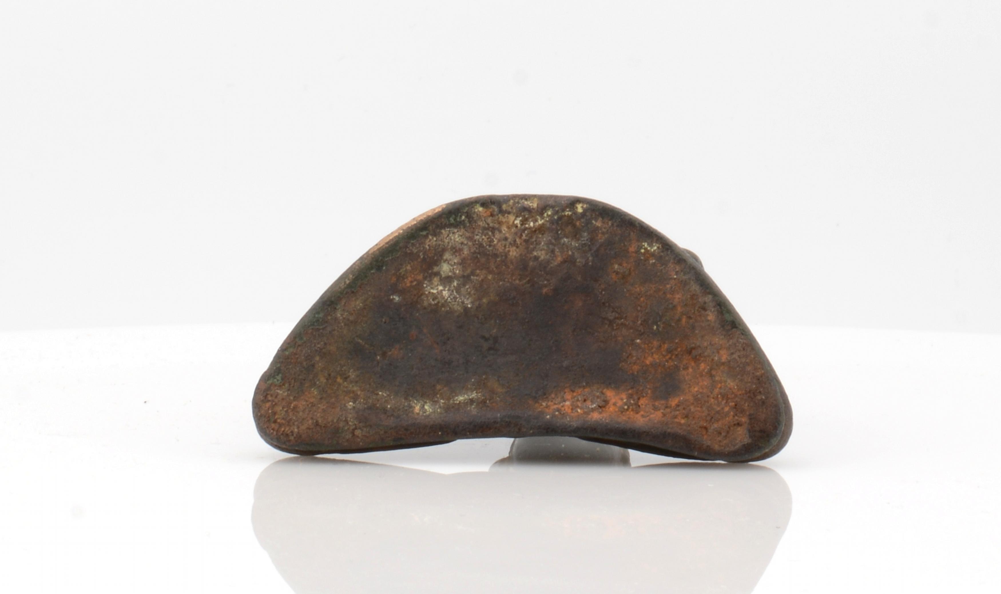 Technik: Bronze, dickwandiger Guss mit Gusskern, glänzende, schwärzliche Patina und Reste von Vergoldung. Erdanhaftungen. Steinbesatz.