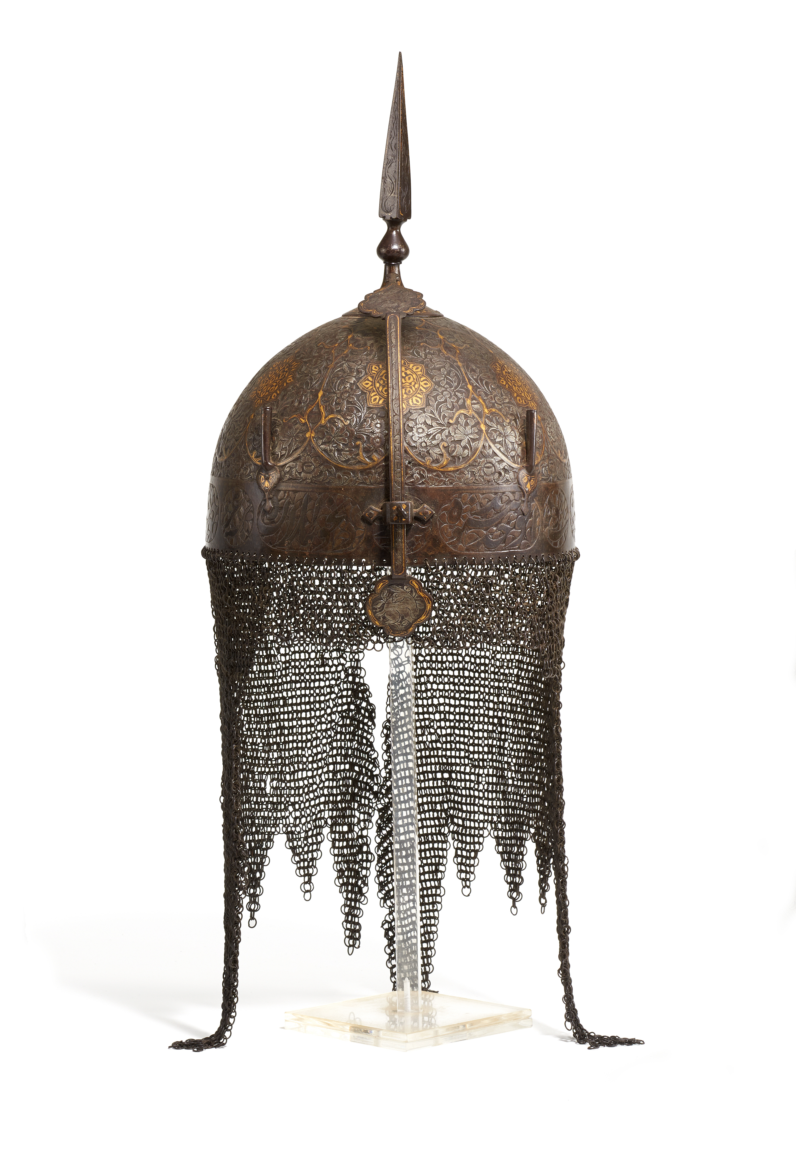 Technik: Eisen mit Goldeinlagen (koftgari), Nackenschutz in Kettgeflecht (zirah).