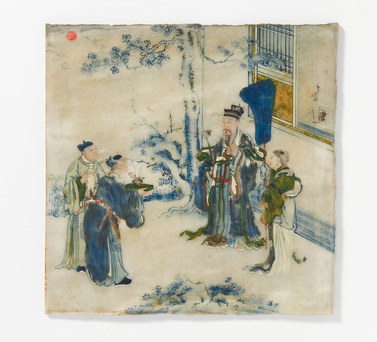 Beschreibung: Unter einem wutong-Baum steht ein älterer Gelehrter mit Hofrang in Begleitung einer Dienerin mit Ehrenfächer und empfängt zwei Herren. Einer offeriert ein Libations- oder Trinkgefäß auf einem Tablett, der zweite hält eine Kanne. Auf der Rückseite ein fünfzeiliges Gedicht über Pflaumenblüten und Bambus. Signatur und drei Siegel ungelesen.