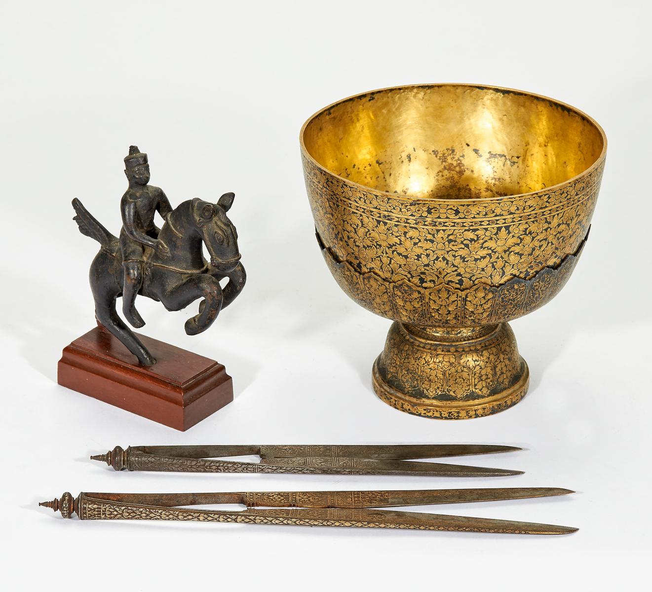 BUDDHA AUF SEINEM PFERD KANTHAKA, EINE SCHALE FÜR GEWEIHTES WASSER UND ZWEI SCHEREN FÜR DIE KONECHOOK-ZEREMONIE.