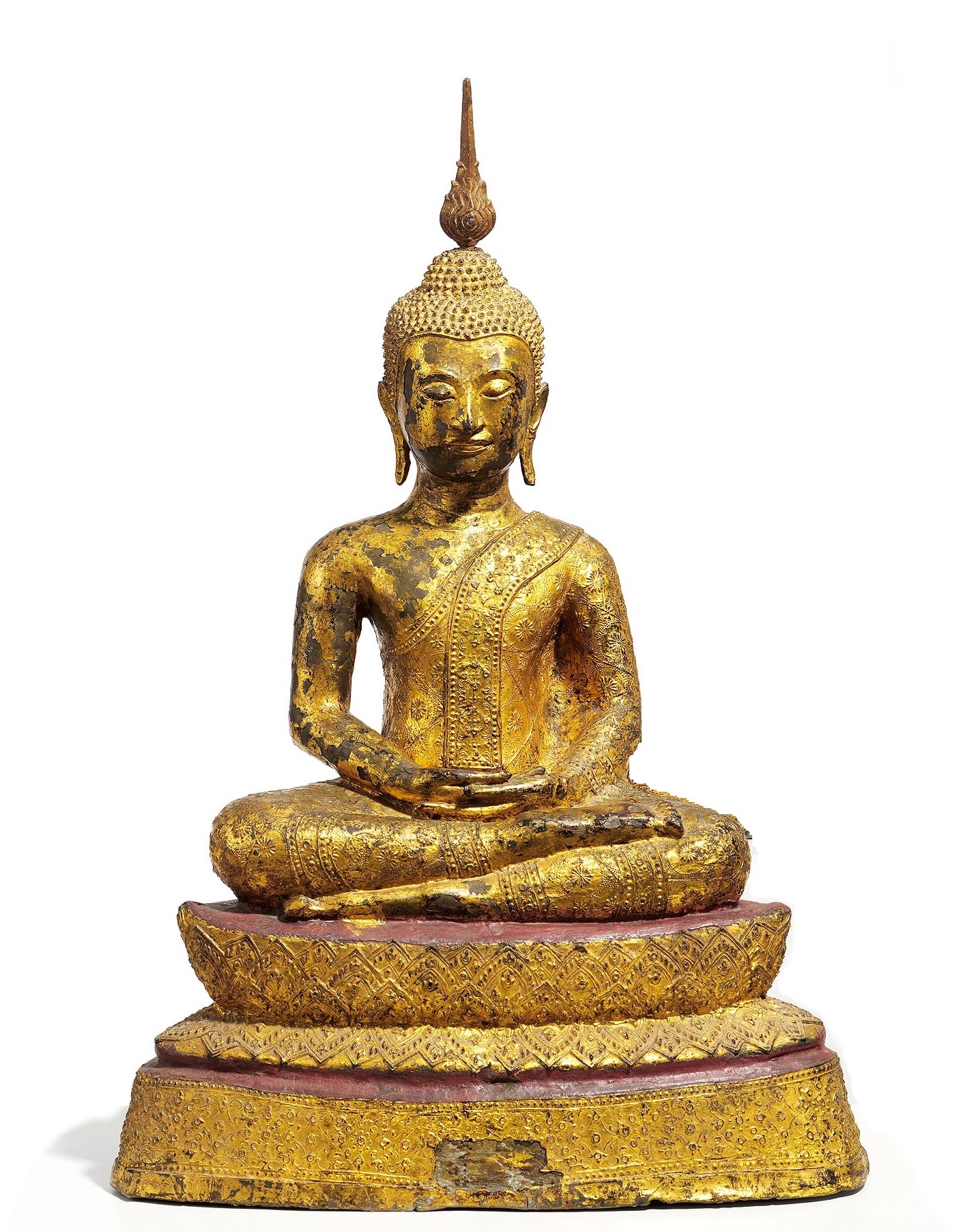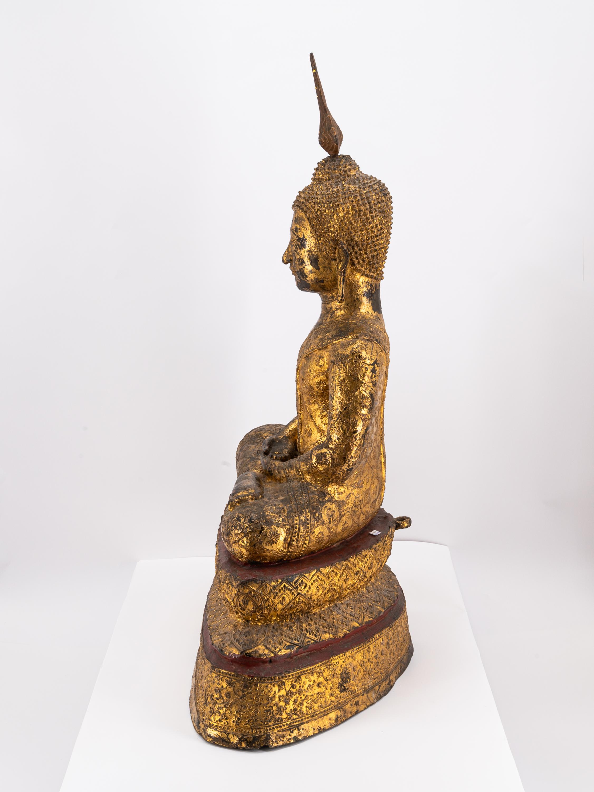 BUDDHA IM FÜRSTENSCHMUCK AUF THRONSOCKEL SITZEND.
