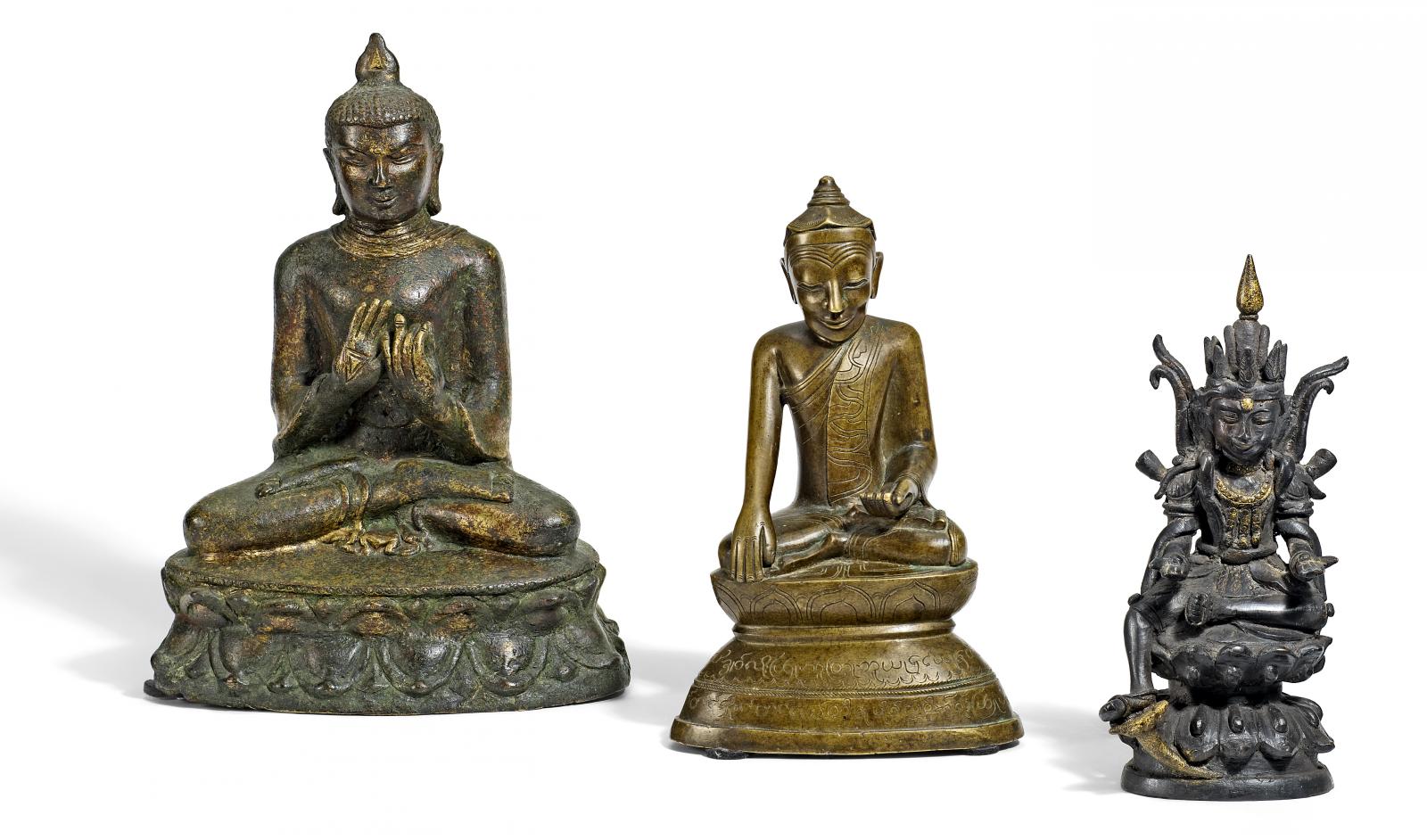BUDDHA IM PAGAN-STIL AUF EINEM DOPPELTEN LOTOSTHRON. BRONZE.