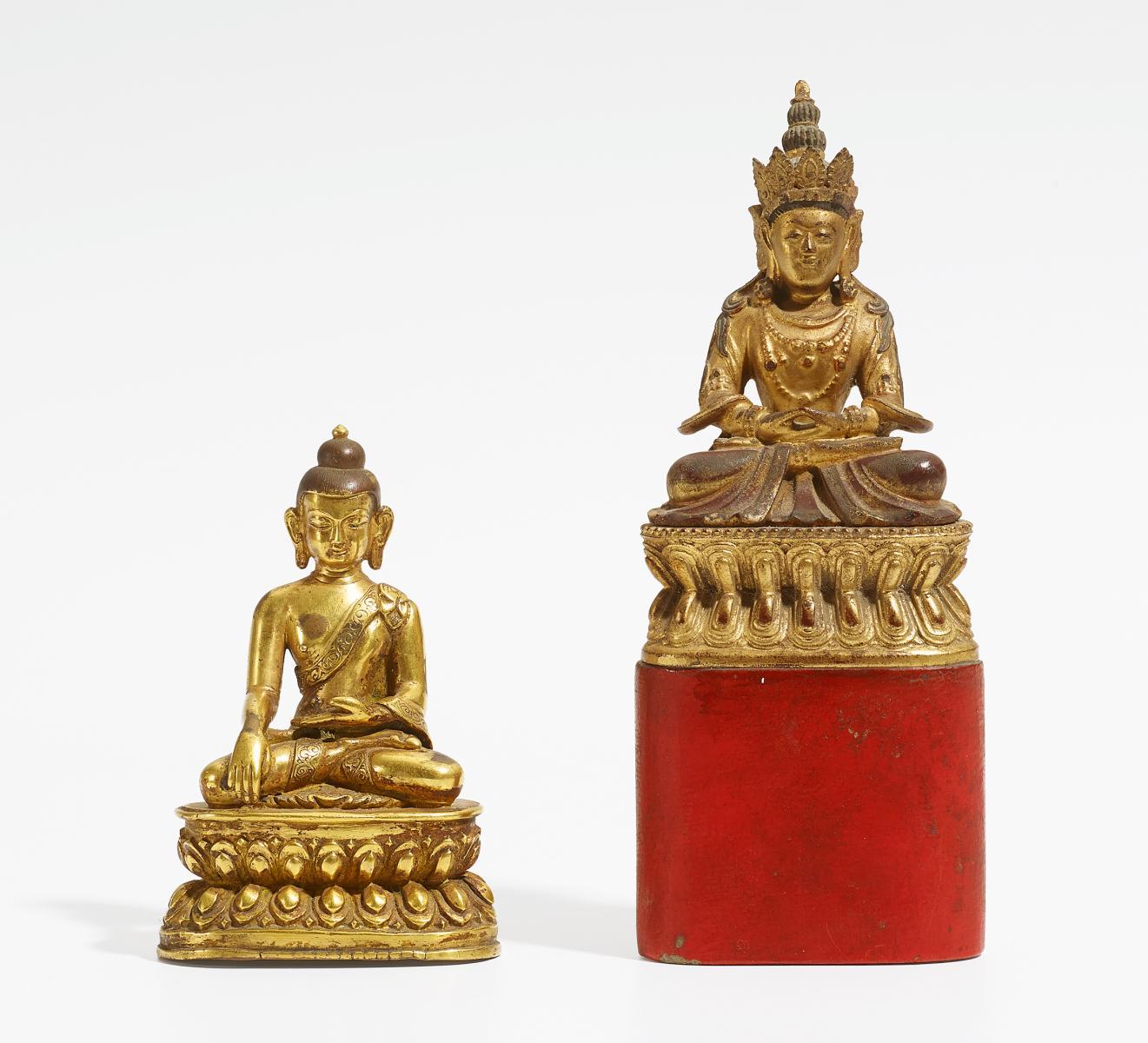 Zustand A/B. Beilage: Amitayus auf hohem Sockel. Holz geschnitzt und vergoldet. Tibet/Nepal, 20. Jh. Gesamt-H. 16,1cm. Zustand A/B.