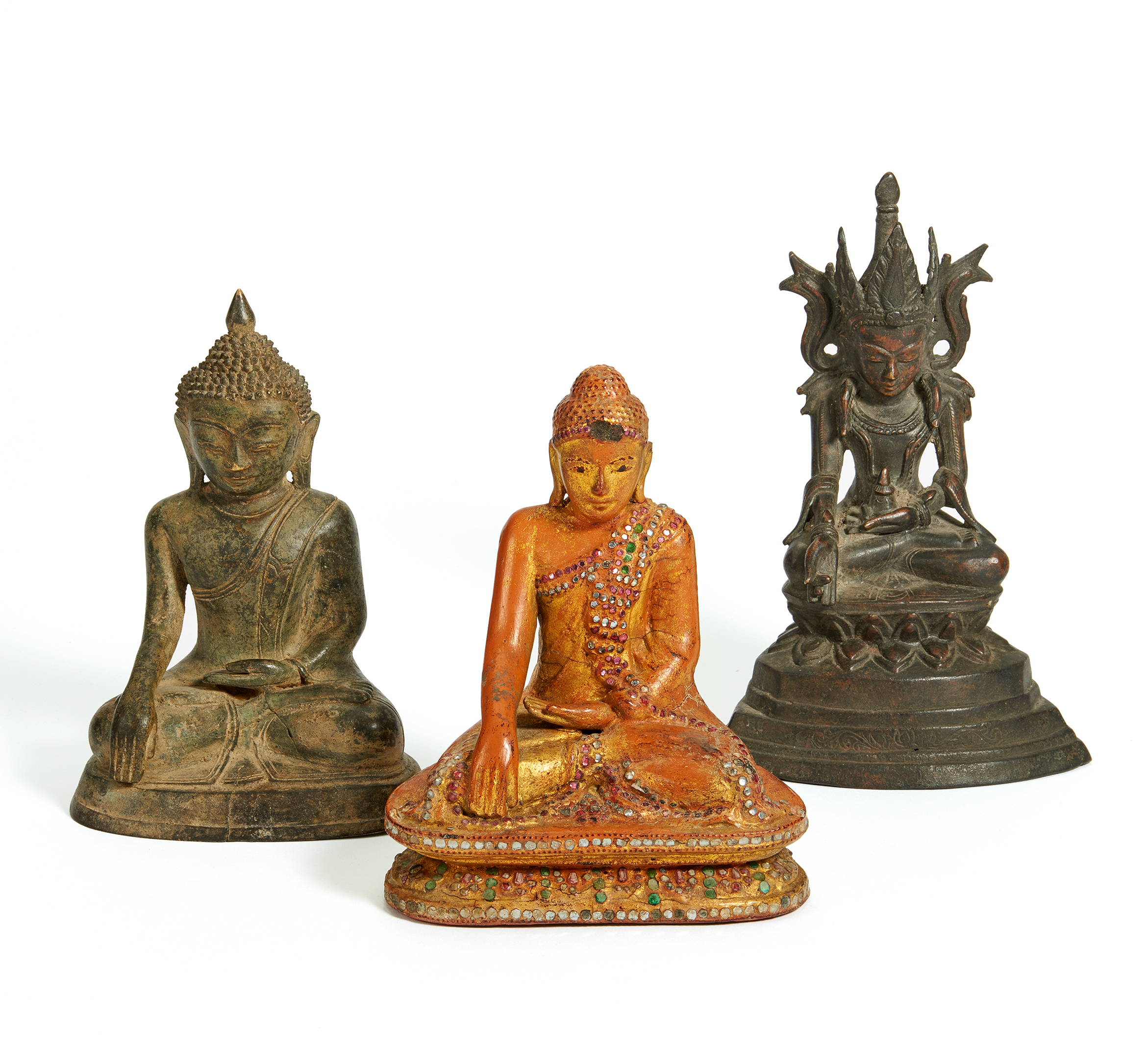 Zustand A/B. Beilage: Buddha maravijaya. Holz, lackiert und mit Spiegeleinlagen. Mandalay-Stil. Burma. H.17,8cm. Zustand A/B.
